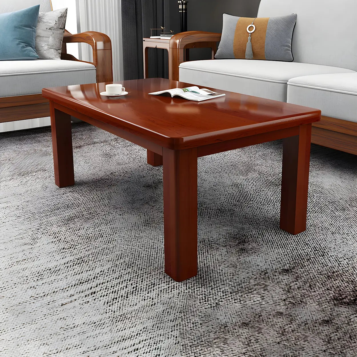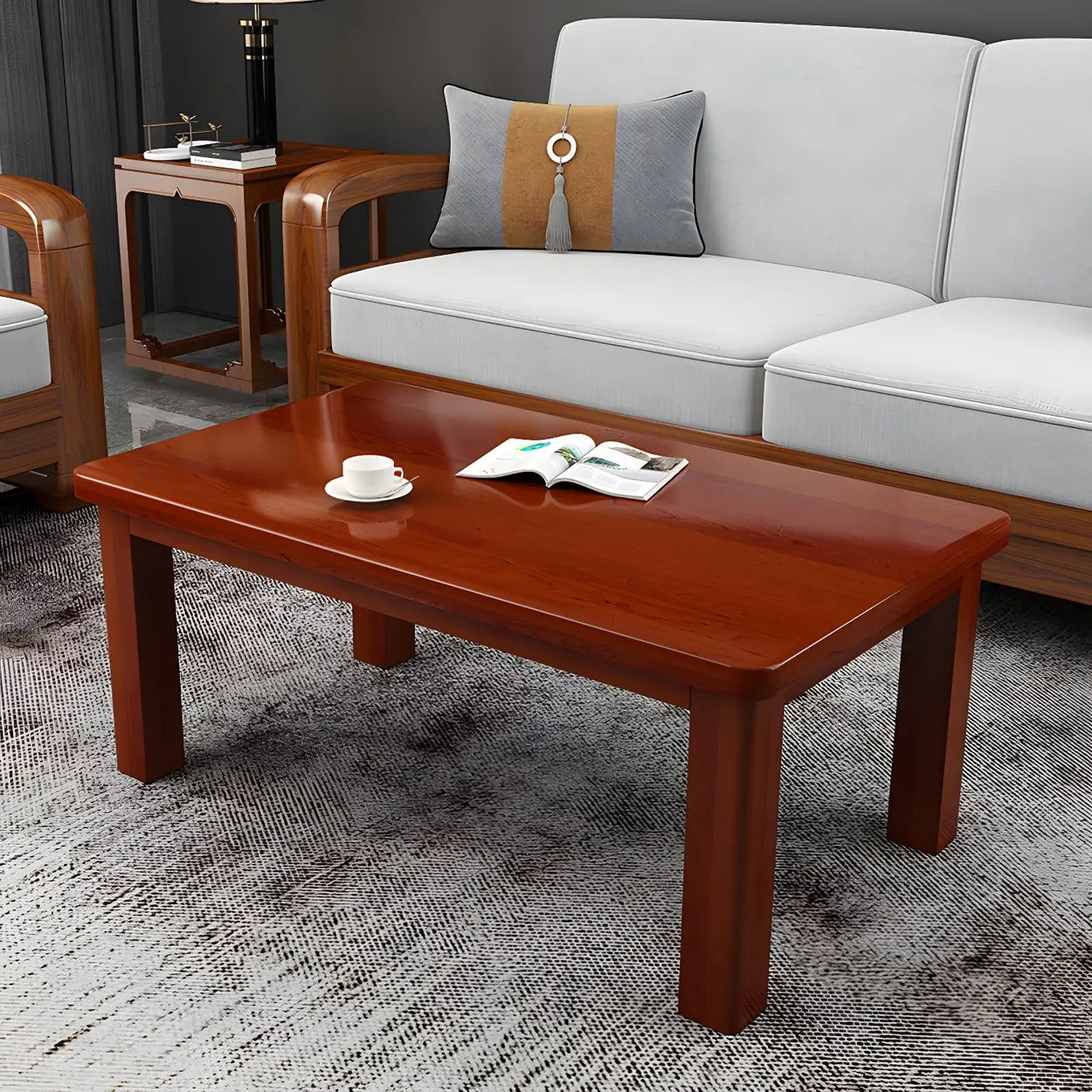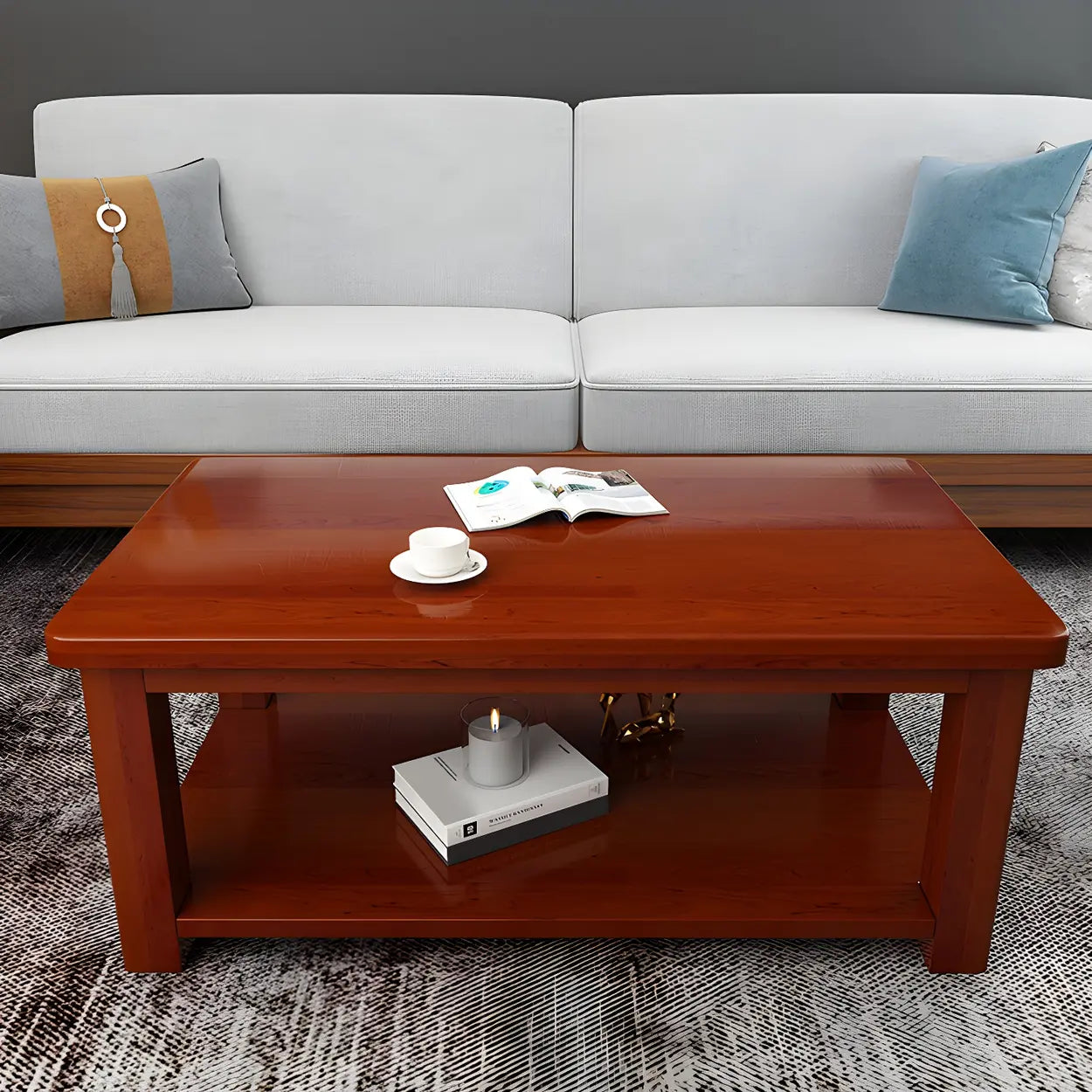 Combining simple lines with fine-grade solid wood, this classic rectangular coffee table makes an ideal choice for your living room. The bright red-brown color adds a touch of warmth and elegance to your home. This coffee table is not only available in several sizes but also fitted with practical storage space, perfect for your multi-functional needs.
