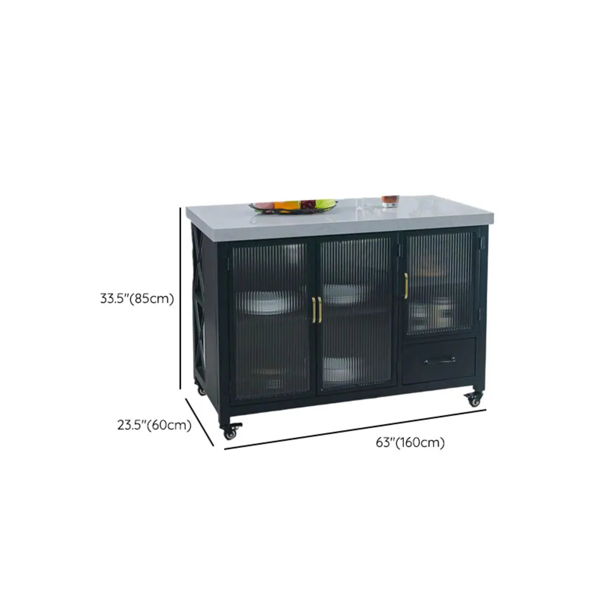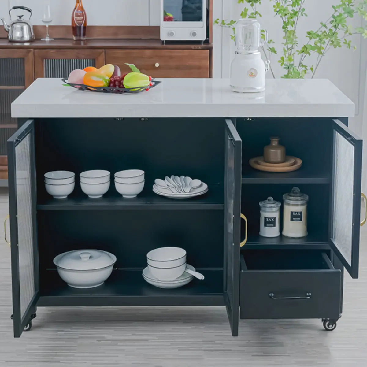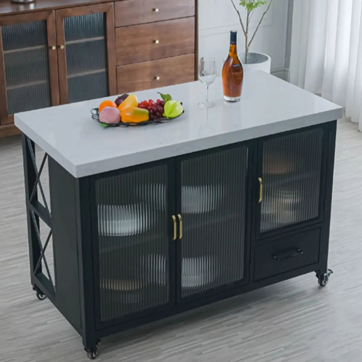 This black marble kitchen island gives many storage solutions. Ideal for preparing gourmet meals or hosting social gatherings, it gives you ample workspace and organizational functions. What's more, this flexibly adjustable mobile kitchen island helps you maximize your kitchen space.