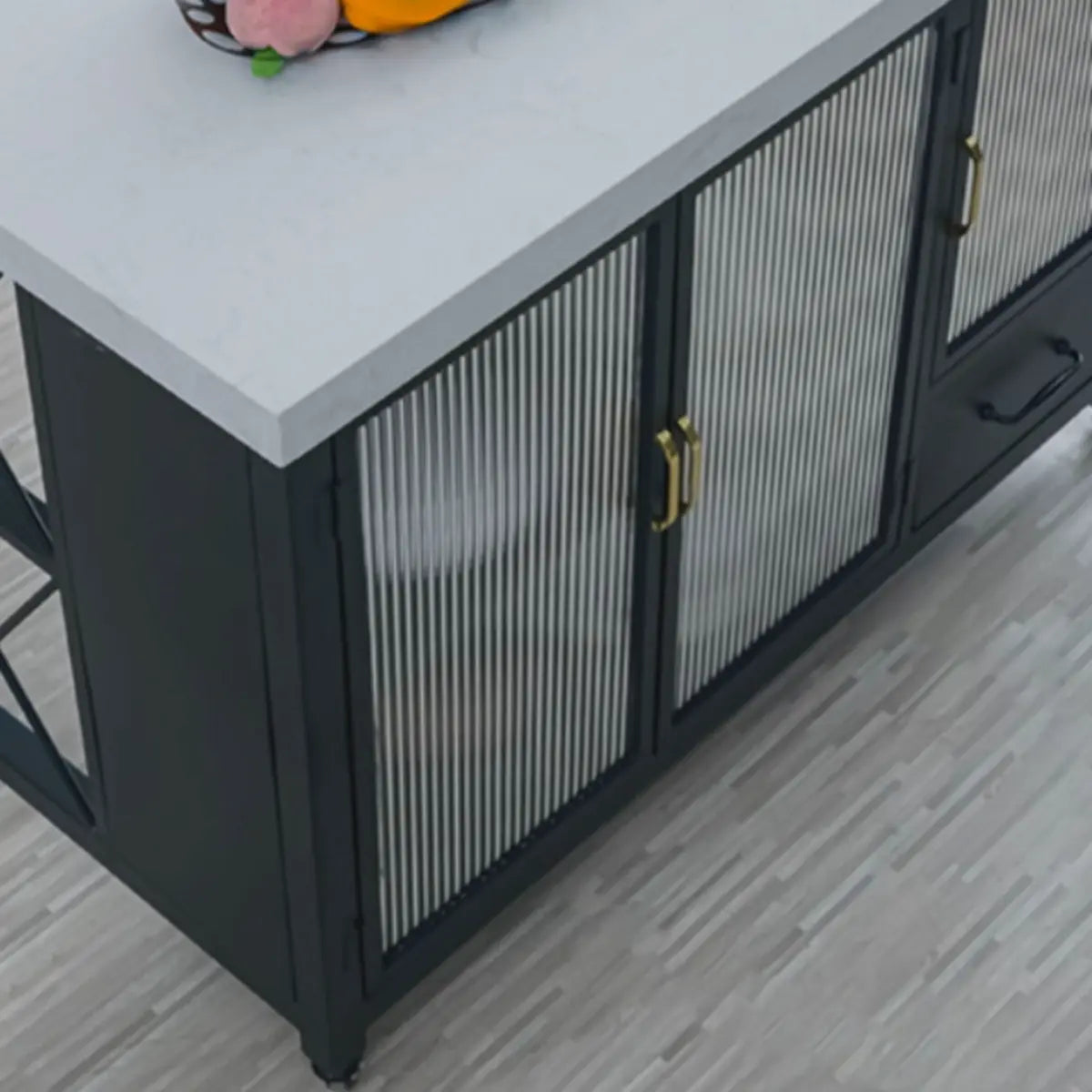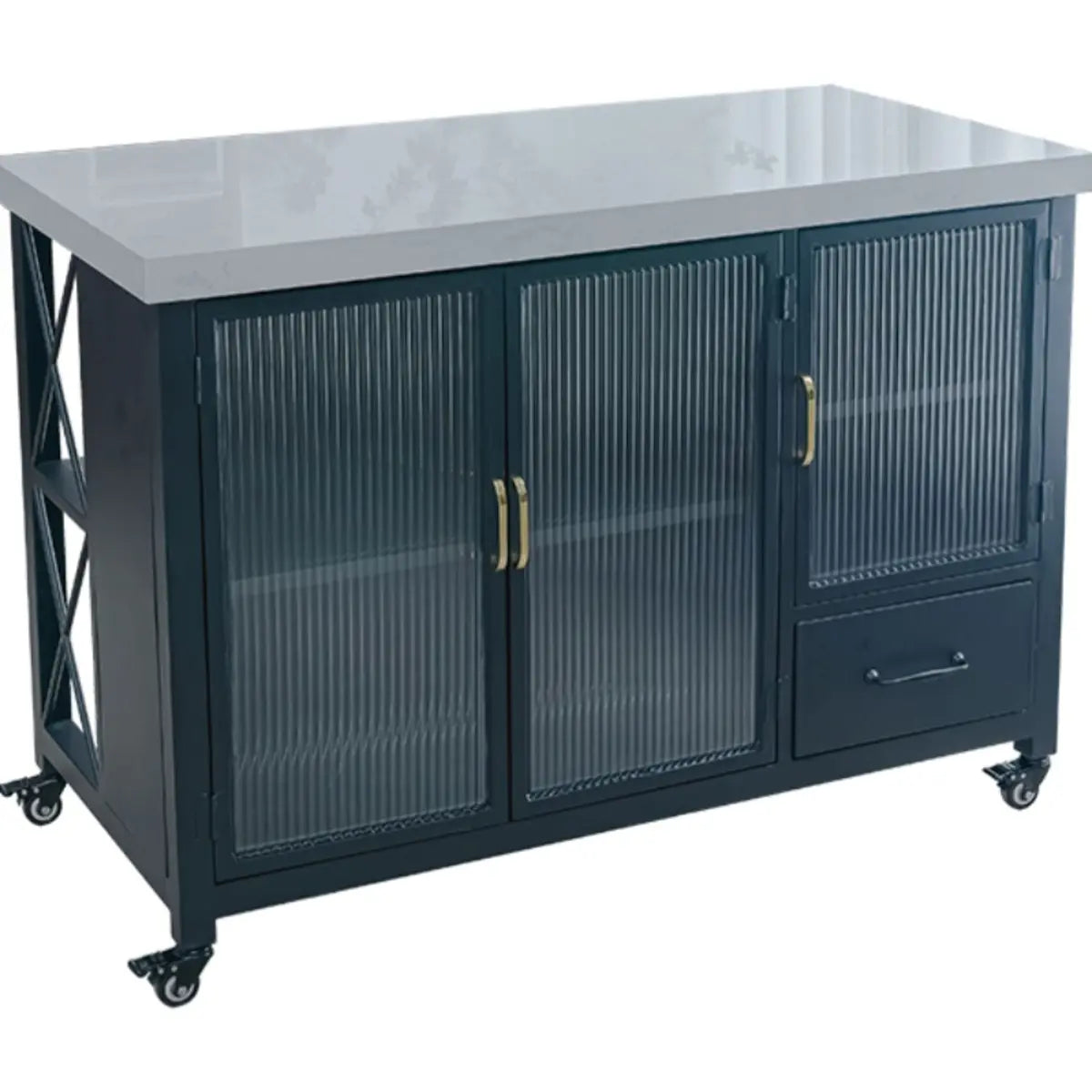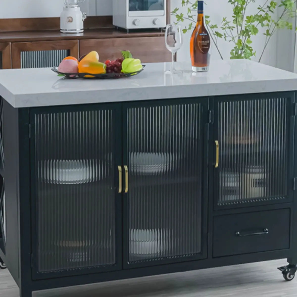 This black marble kitchen island gives many storage solutions. Ideal for preparing gourmet meals or hosting social gatherings, it gives you ample workspace and organizational functions. What's more, this flexibly adjustable mobile kitchen island helps you maximize your kitchen space.
