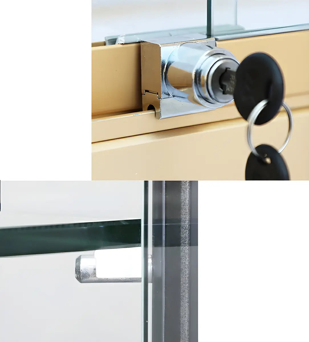 This trendy short metal glass cabinet is stylish and practical and is an ideal tool for displaying various decorations and collections. With transparent glass doors and secure sliding locks, it provides a safe and elegant display platform for your precious collections. Whether in the living room or study, it can add a touch of chic charm to your space.
