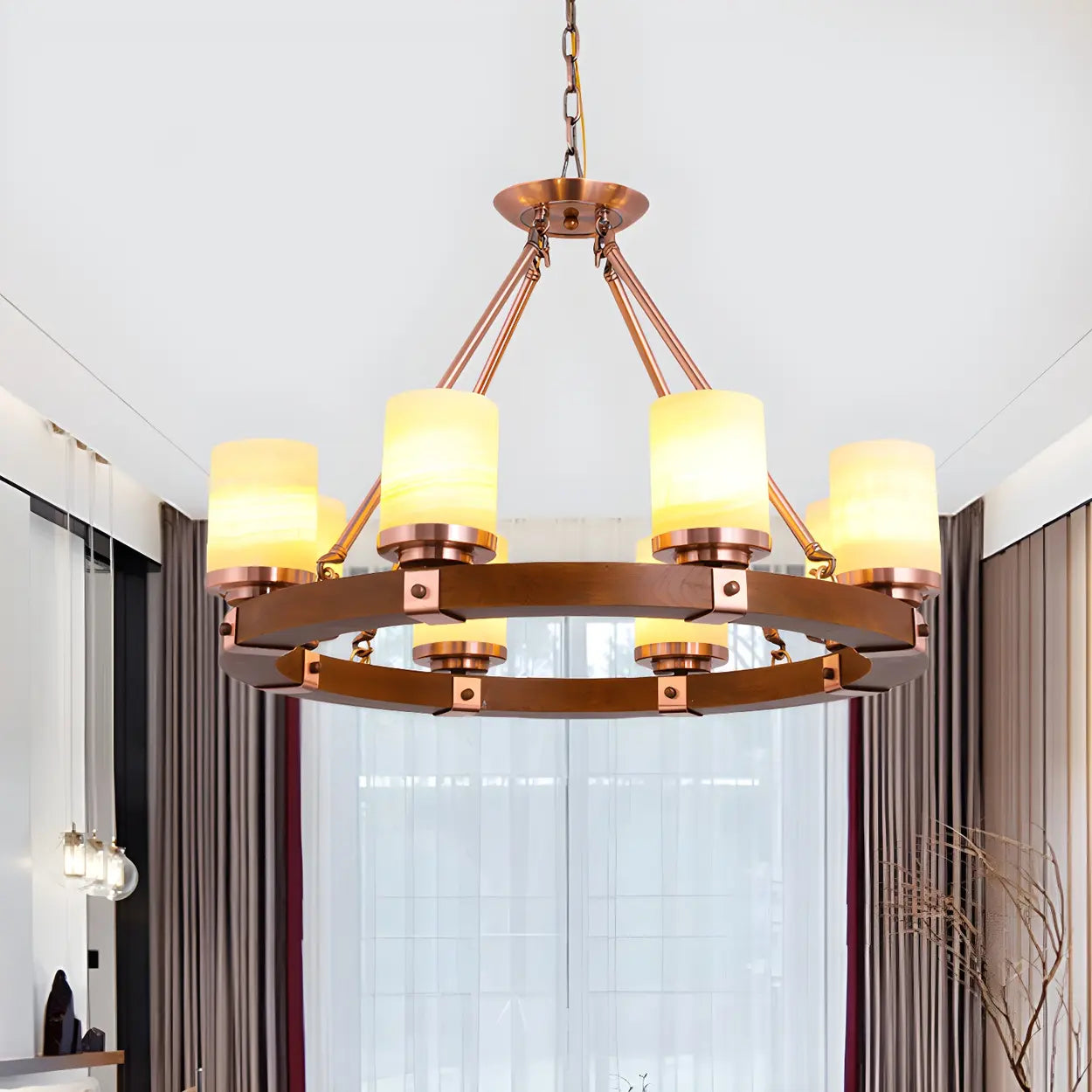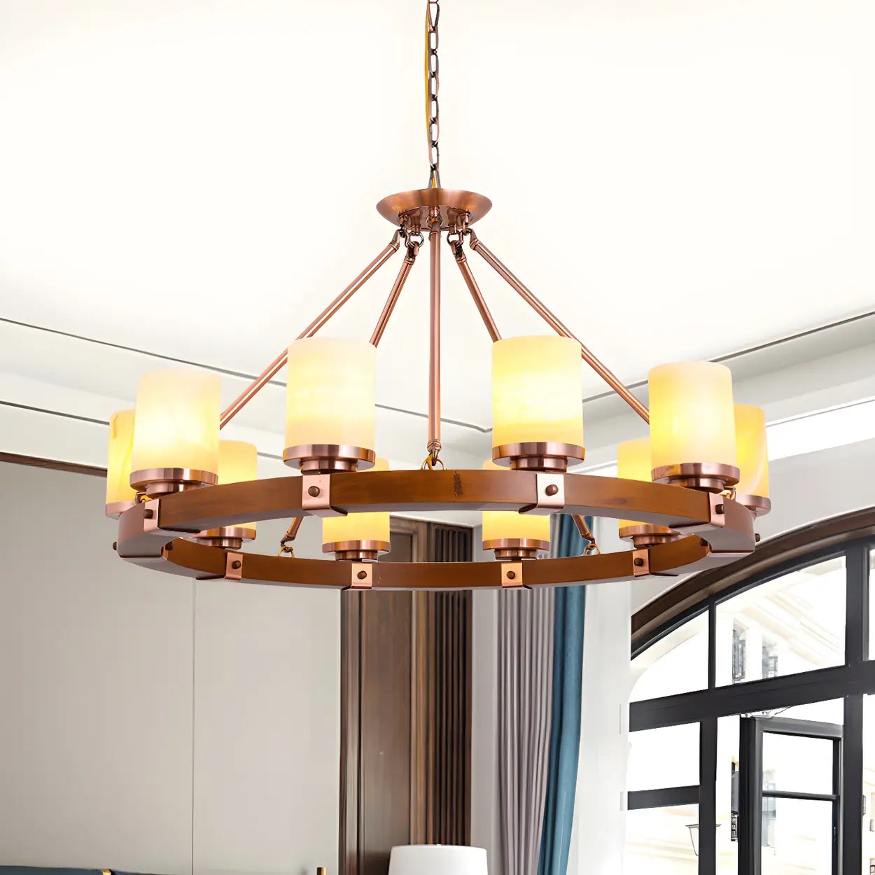 This classic cylindrical chandelier features a premium shade and an elegant wooden round design, perfectly blending vintage and modern styles. Its warm brown tone adds a touch of soft luxury to any interior space. This chandelier is ideal for both spacious living rooms and elegant dining rooms, enhancing the beauty of your home.