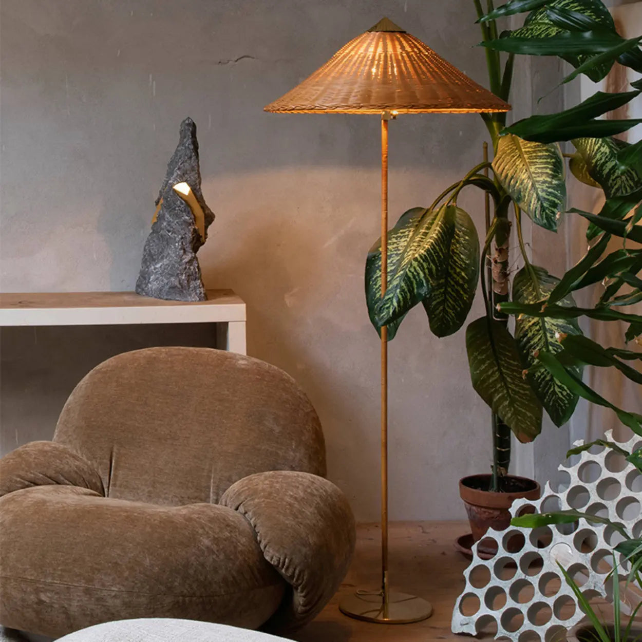 Anchored by a sturdy metal base with a brushed gold finish, this lamp stands securely on various floor types to prevent tipping. The metallic accent adds a touch of luxury and contrasts beautifully with the natural tone of the shade.