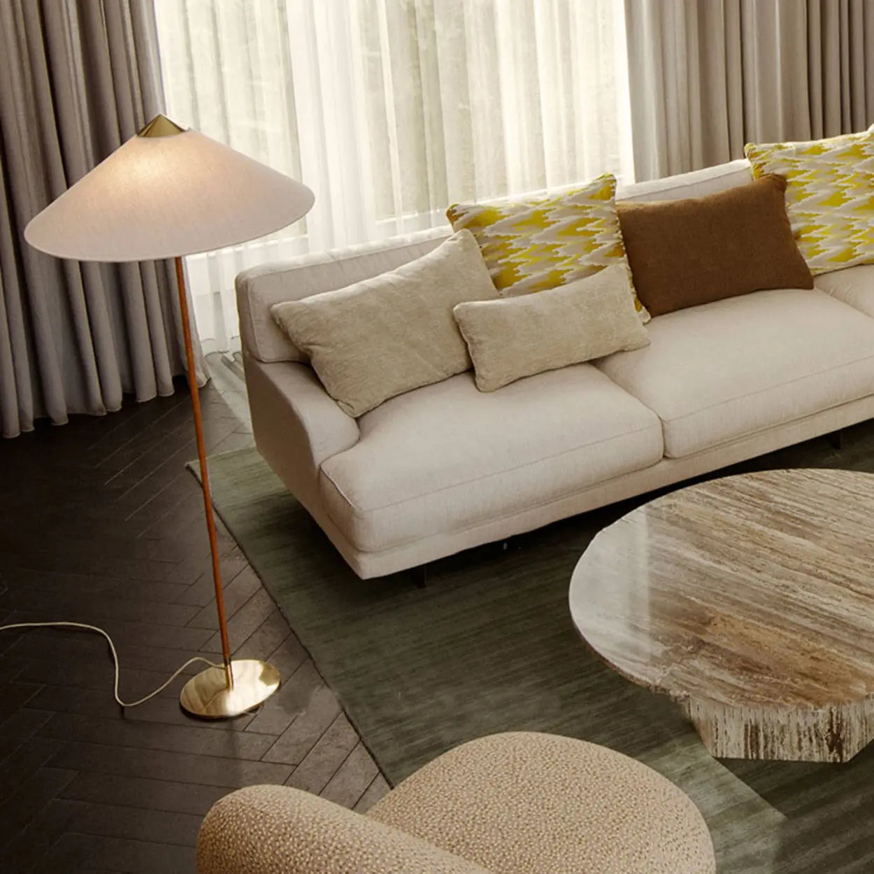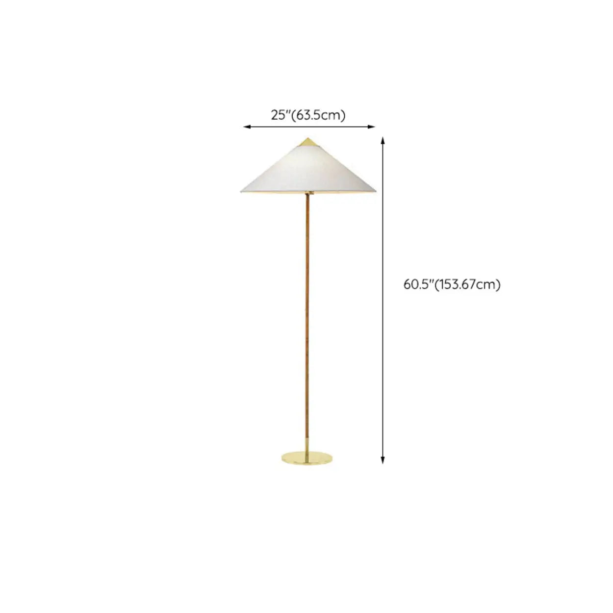 This floor lamp adds a geometric focal point to your living room or bedroom. Supported by a slender pole with a gold-finished base, it blends modern simplicity with traditional warmth. It provides effective overhead lighting for reading chairs or cozy corners.