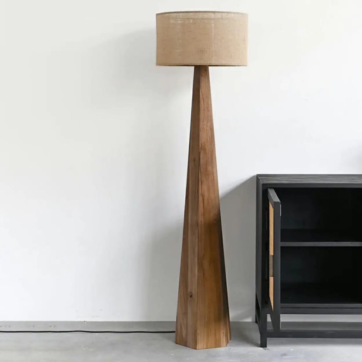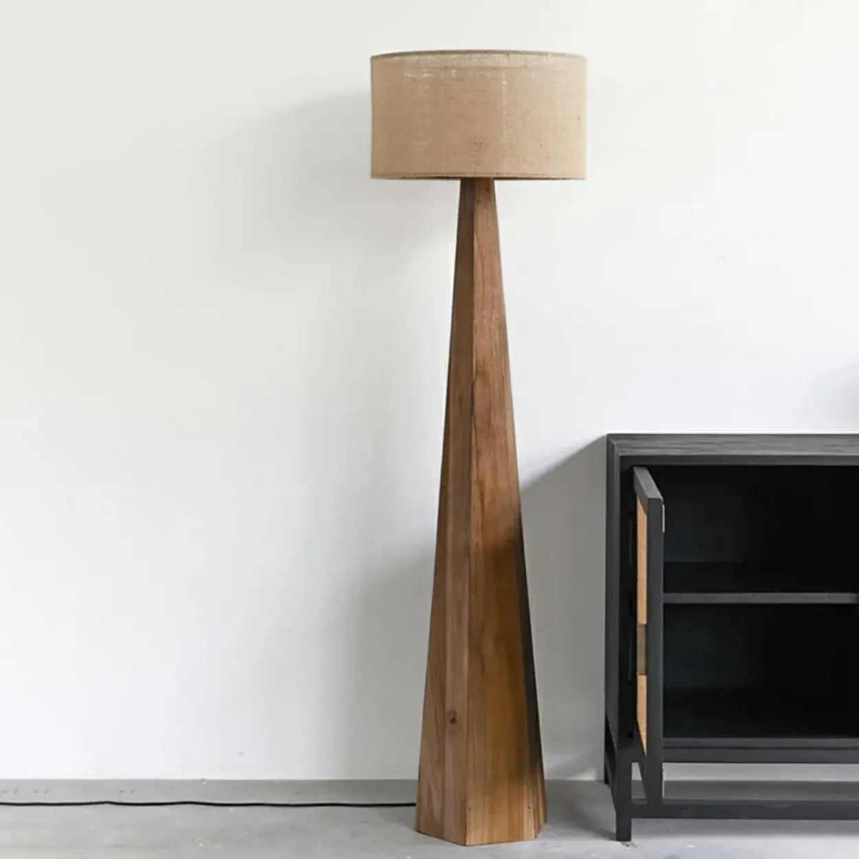 This wood floor lamp brings organic warmth to your living room or bedroom. Featuring a tree base and a classic fabric drum shade, it stands as a sculptural accent piece. The soft illumination creates a calming atmosphere, making it an ideal choice for reading corners or relaxing spaces.
