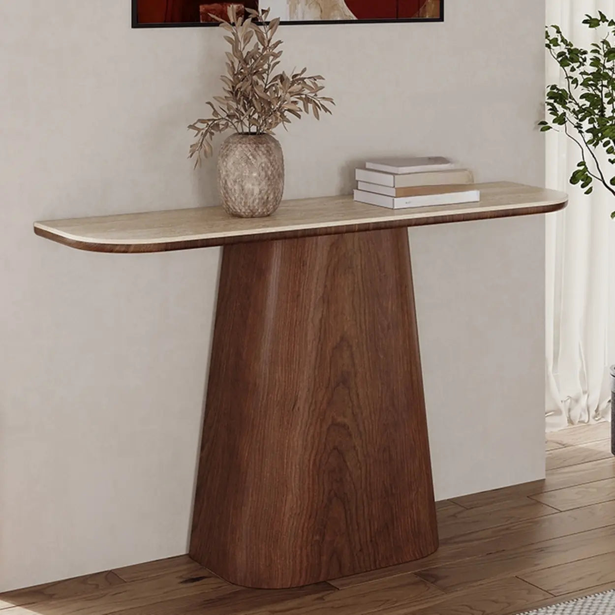 Scandinavian Brown Wood Pedestal Rectangular Beige Console Table