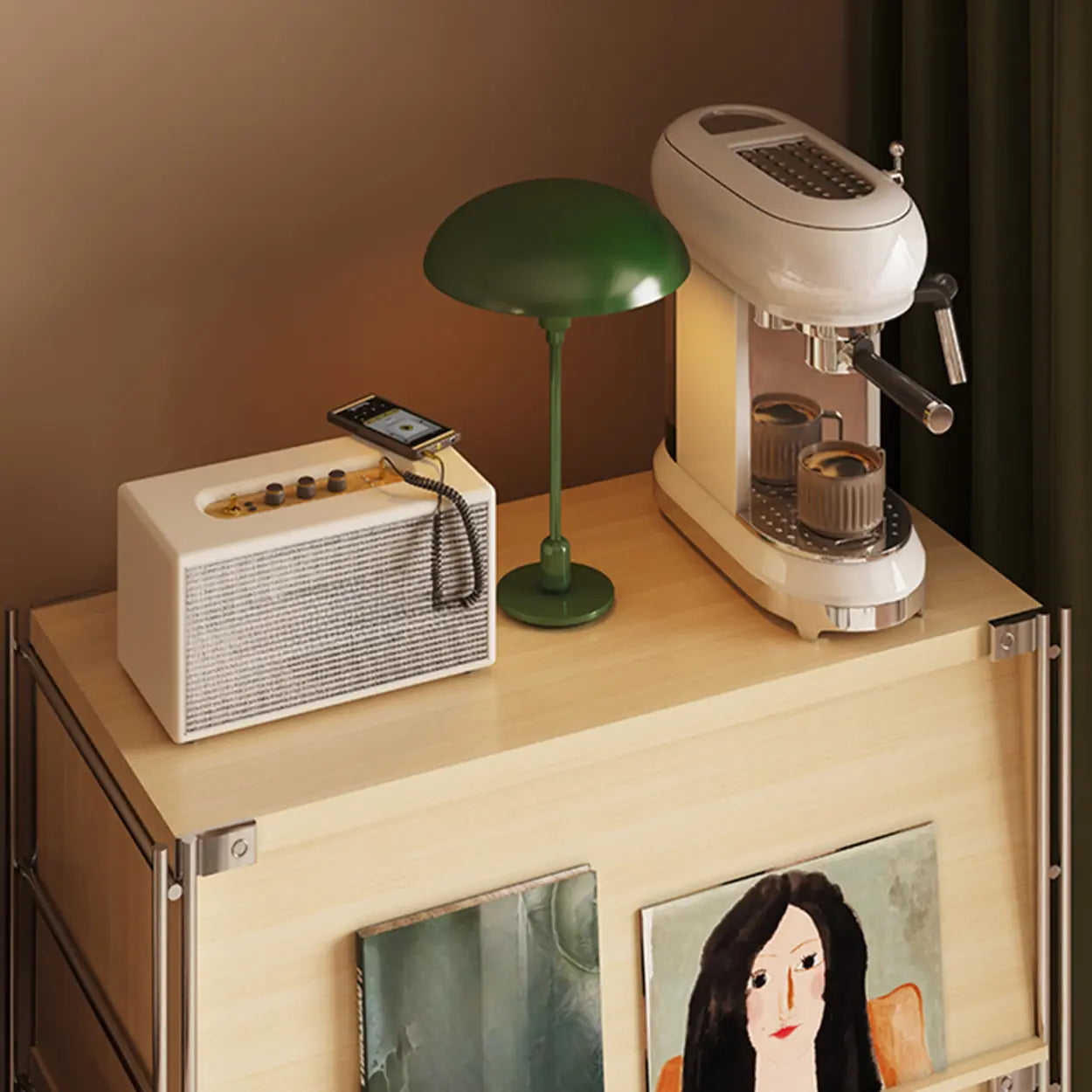 This 43-inch high storage unit combines a sleek metal frame with warm wood finishes to organize your living space. It features spacious drawers and a unique upper cabinet, making it ideal for bedrooms or home offices.