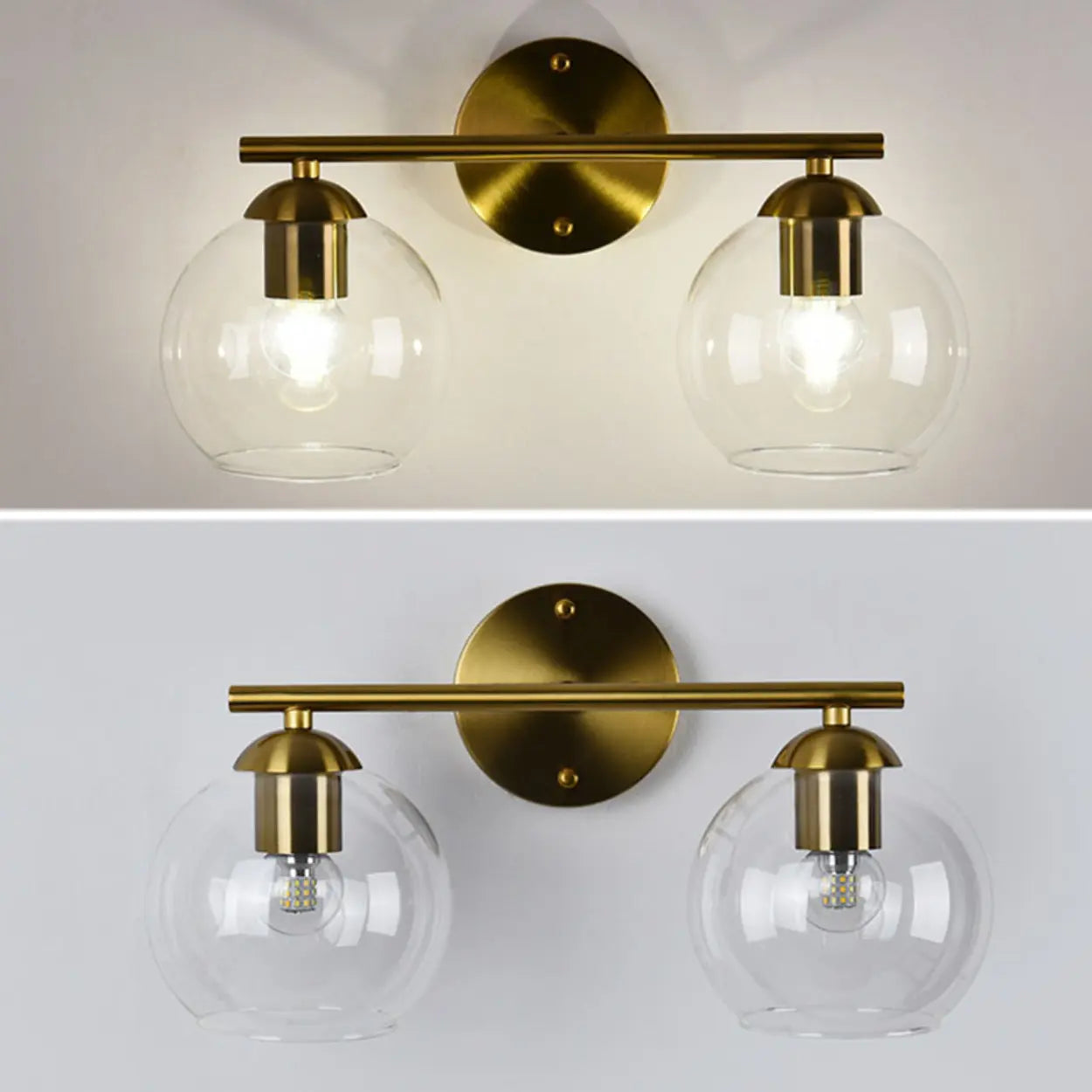 This modern and simple style double-headed glass wall lamp is made of gold brushed metal and transparent glass balls. It is stylish and easy to integrate into various home styles. Whether it is used in the bedroom, living room, corridor or entrance, it can instantly enhance the style and warm atmosphere of the space. The two transparent round ball lampshades create a soft light effect, which is both visually beautiful and provides sufficient lighting, bringing a comfortable experience to your living space. High-quality metal and glass materials ensure that the lamp is durable and easy to clean. This wall lamp is not only a lighting tool, but also a decorative highlight of the space, making home life more ceremonial.