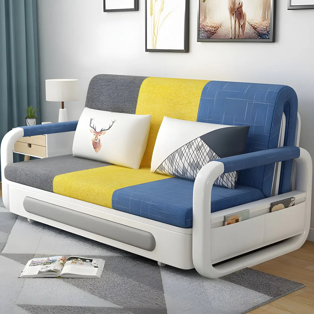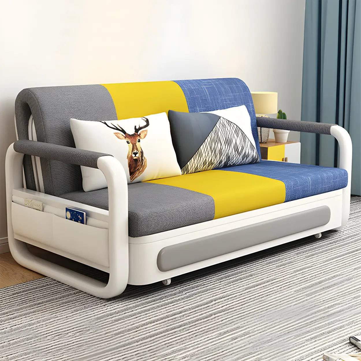 This sofa bed has a modern style with clean lines and stylish blue and yellow tones, which will upgrade the space.