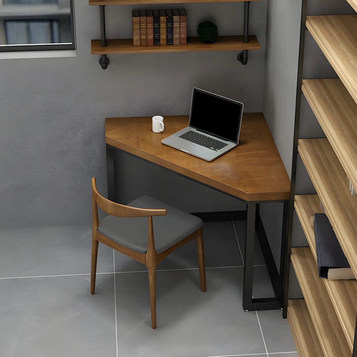 This table is uniquely designed to fit perfectly into the small space of a modern home or office. Its sturdy, solid wood tabletop and durable iron legs not only guarantee its super stability, but also add an industrial, modern feel to your interior space. Whether it is used for a home office or casual reading, this corner table can offer you ample desktop space without taking up too much floor space.