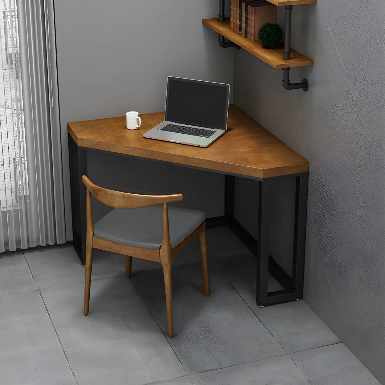 Small Brown Pine Wood Iron Sled Corner Writing Desk - 23.6"L x 23.6"W x 29.5"H / Table Only is backordered and will ship as soon as it is back in stock.