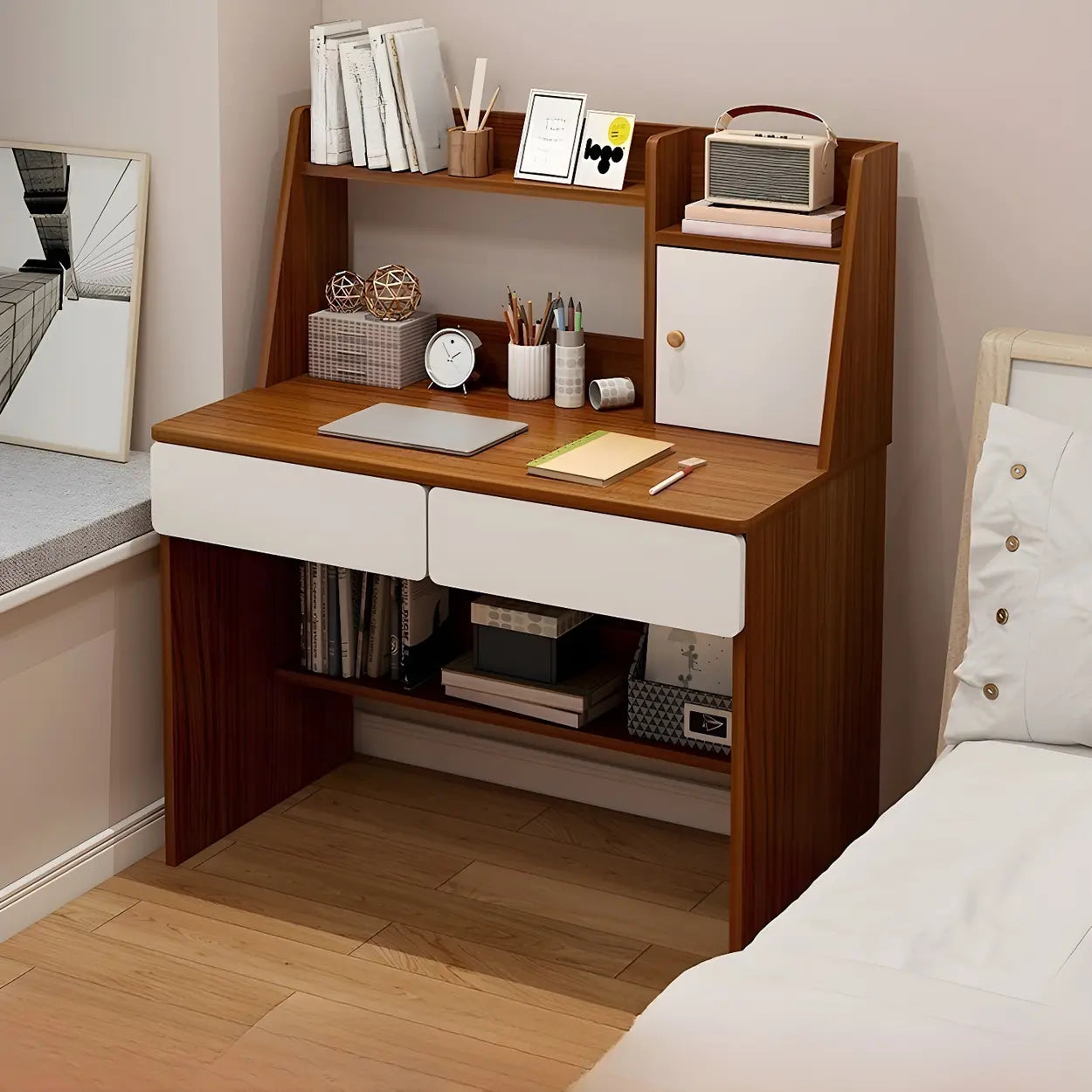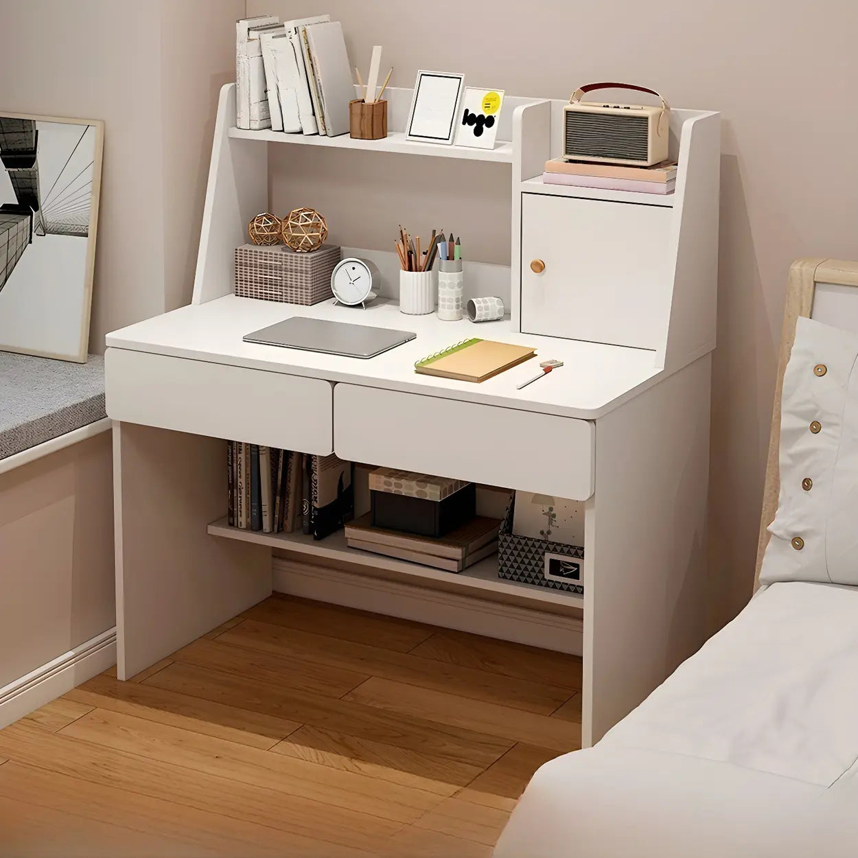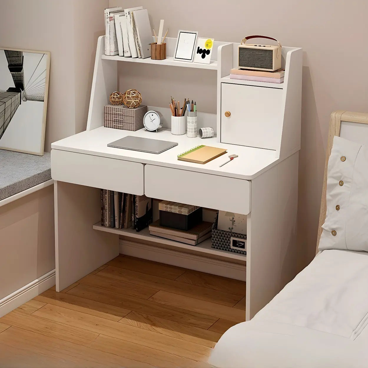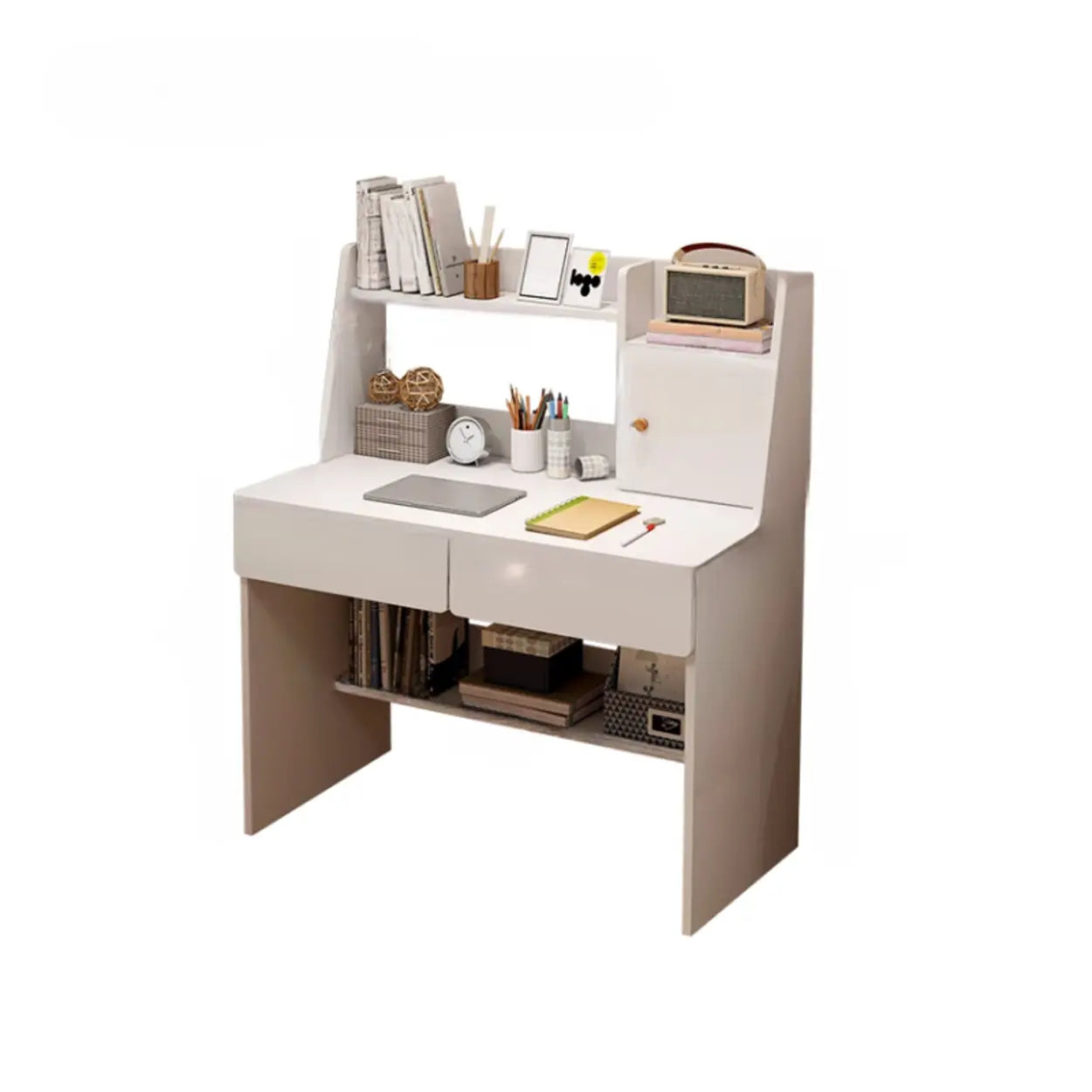 It has multiple shelves and drawers to store books, stationery, and personal items, keeping the desktop tidy.