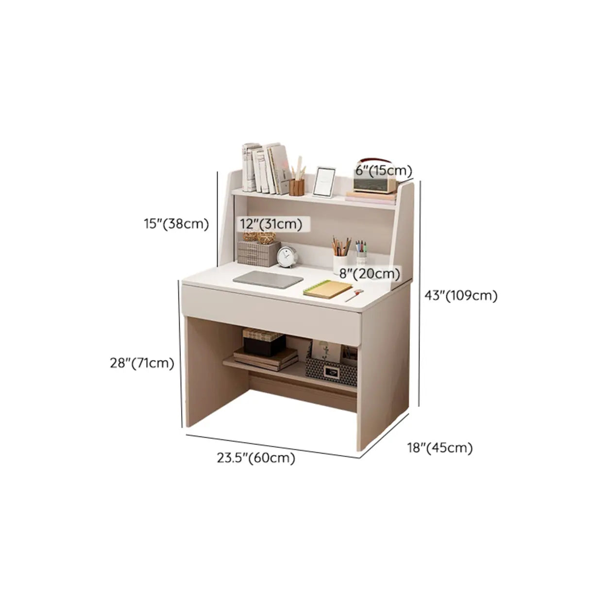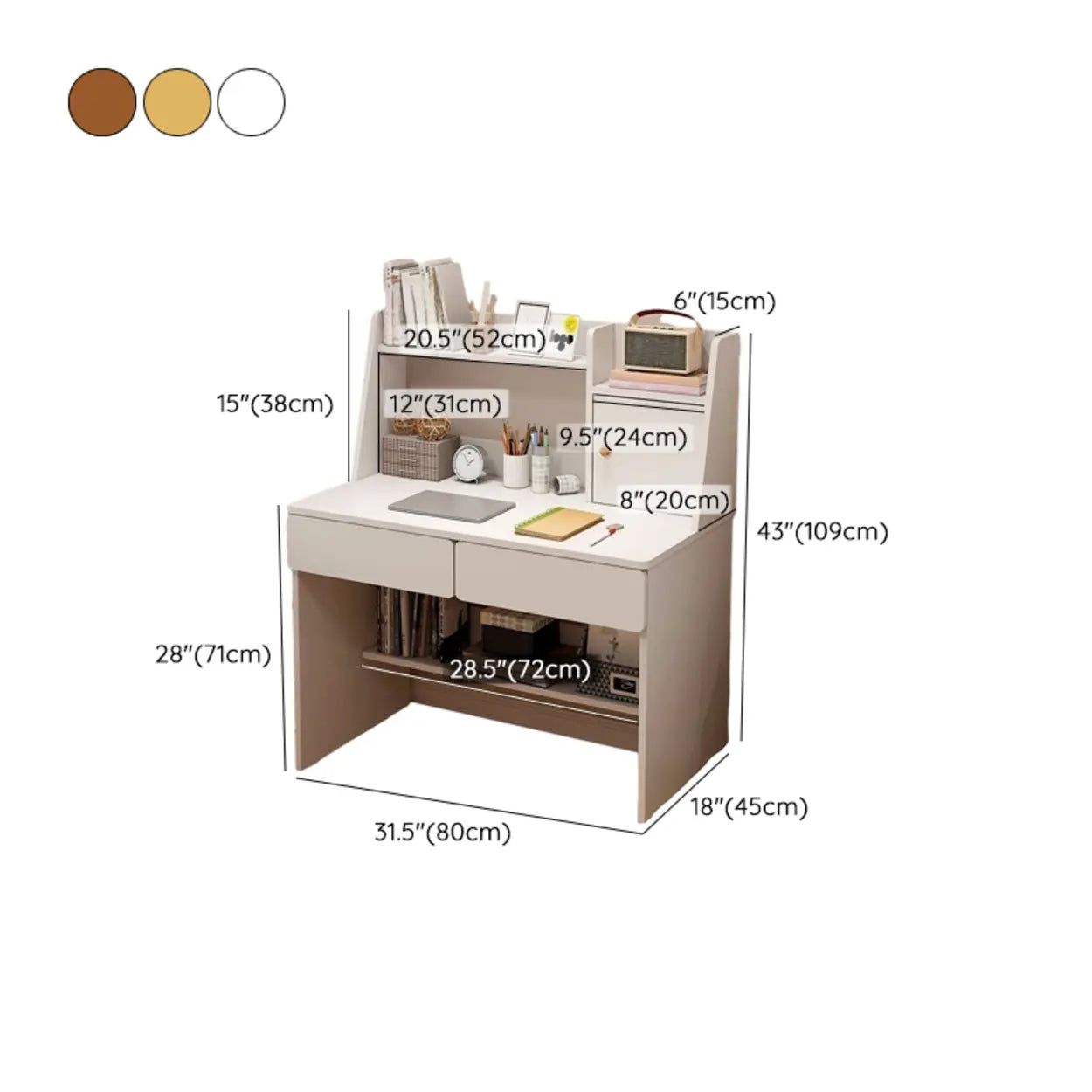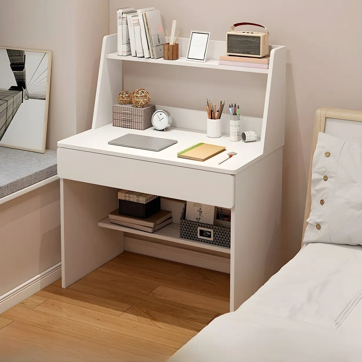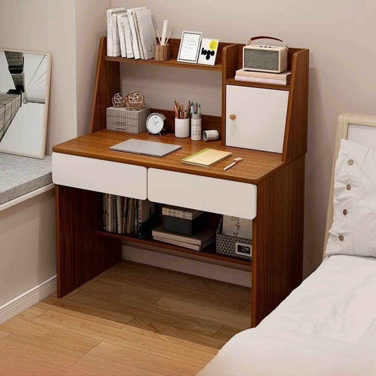 It has multiple shelves and drawers to store books, stationery, and personal items, keeping the desktop tidy.