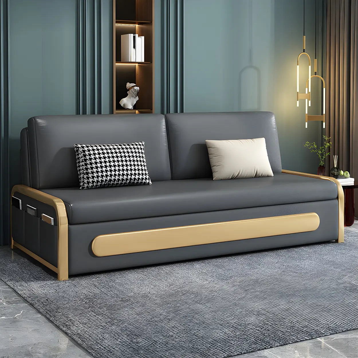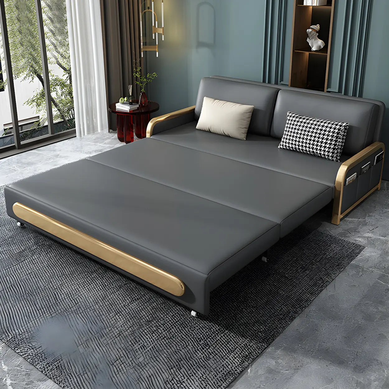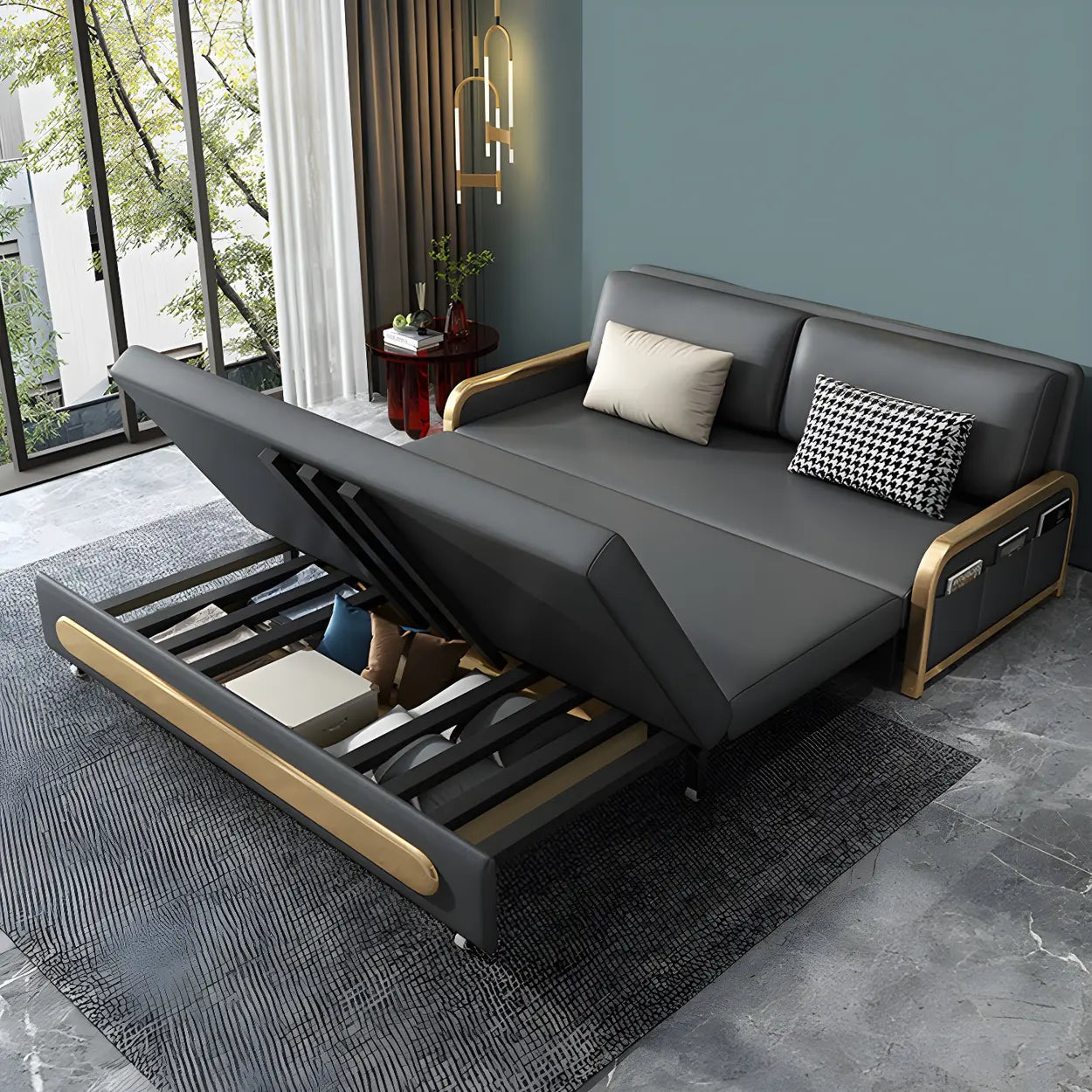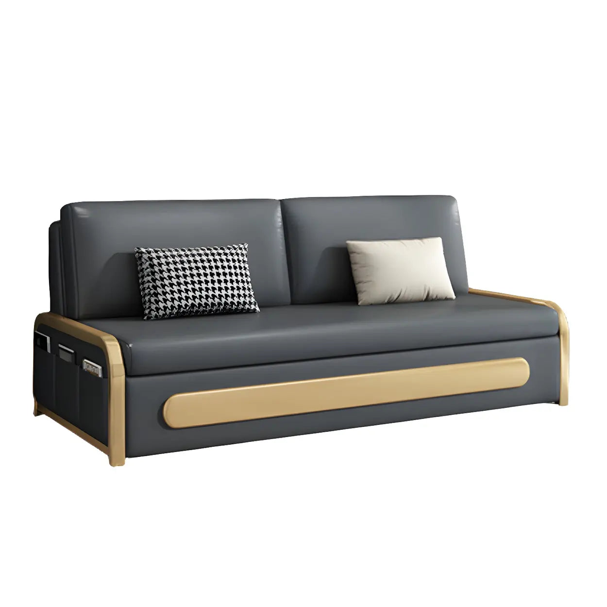 This sofa bed with a dark finish is formed from high-grade artificial leather with unique stain-resistant properties, ideal for use in the parlor, whether for daily rest or entertaining guests. Its elegant gray tone is perfectly combined with wooden details, adding a modern and warm feeling to the home.