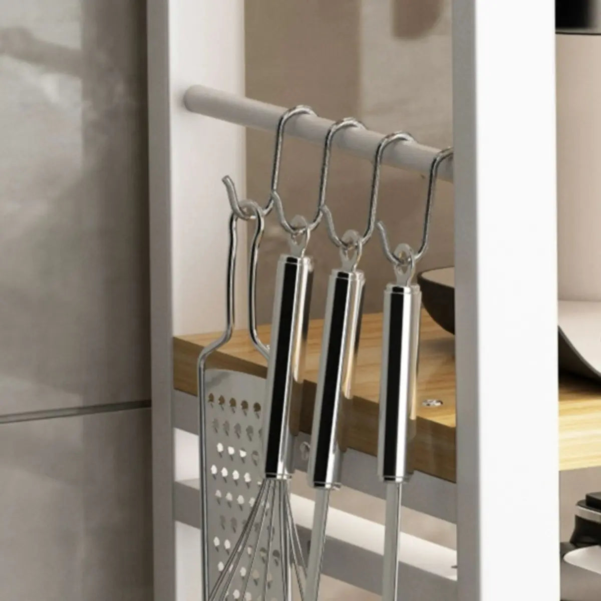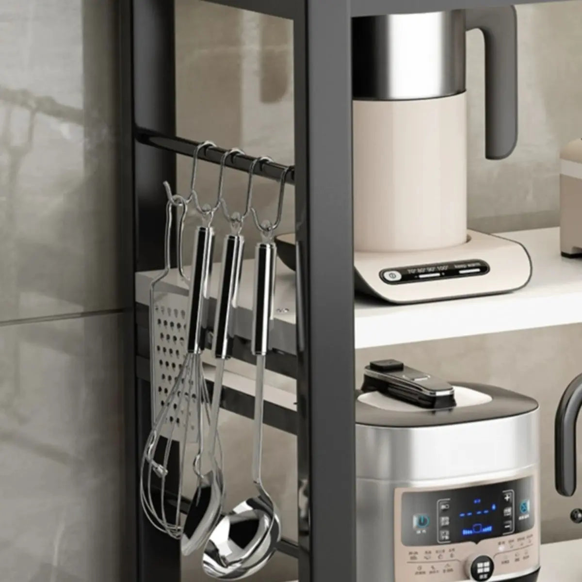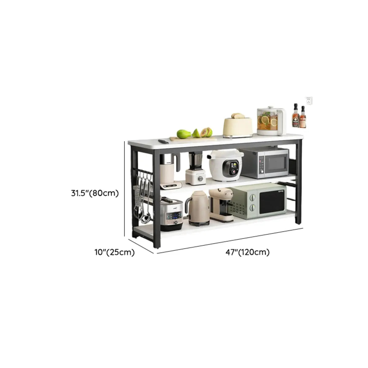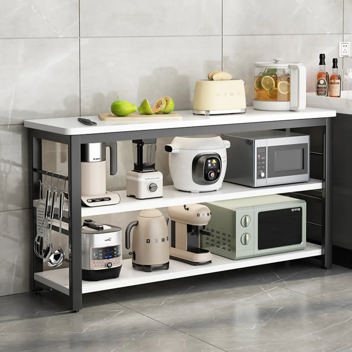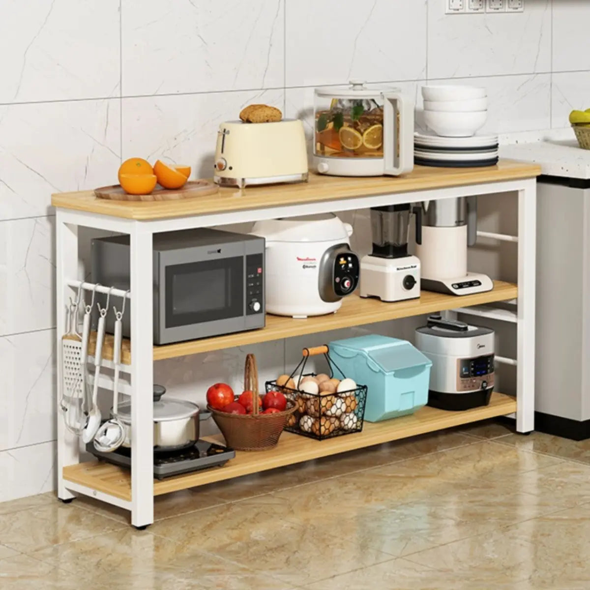 The three-layer open shelf design provides ample storage space for microwave ovens, kitchen utensils and other kitchen appliances.
