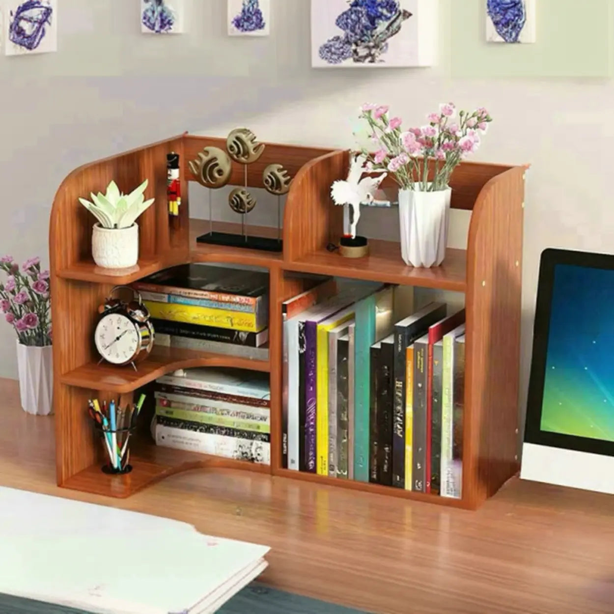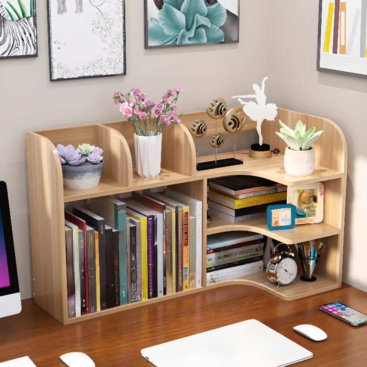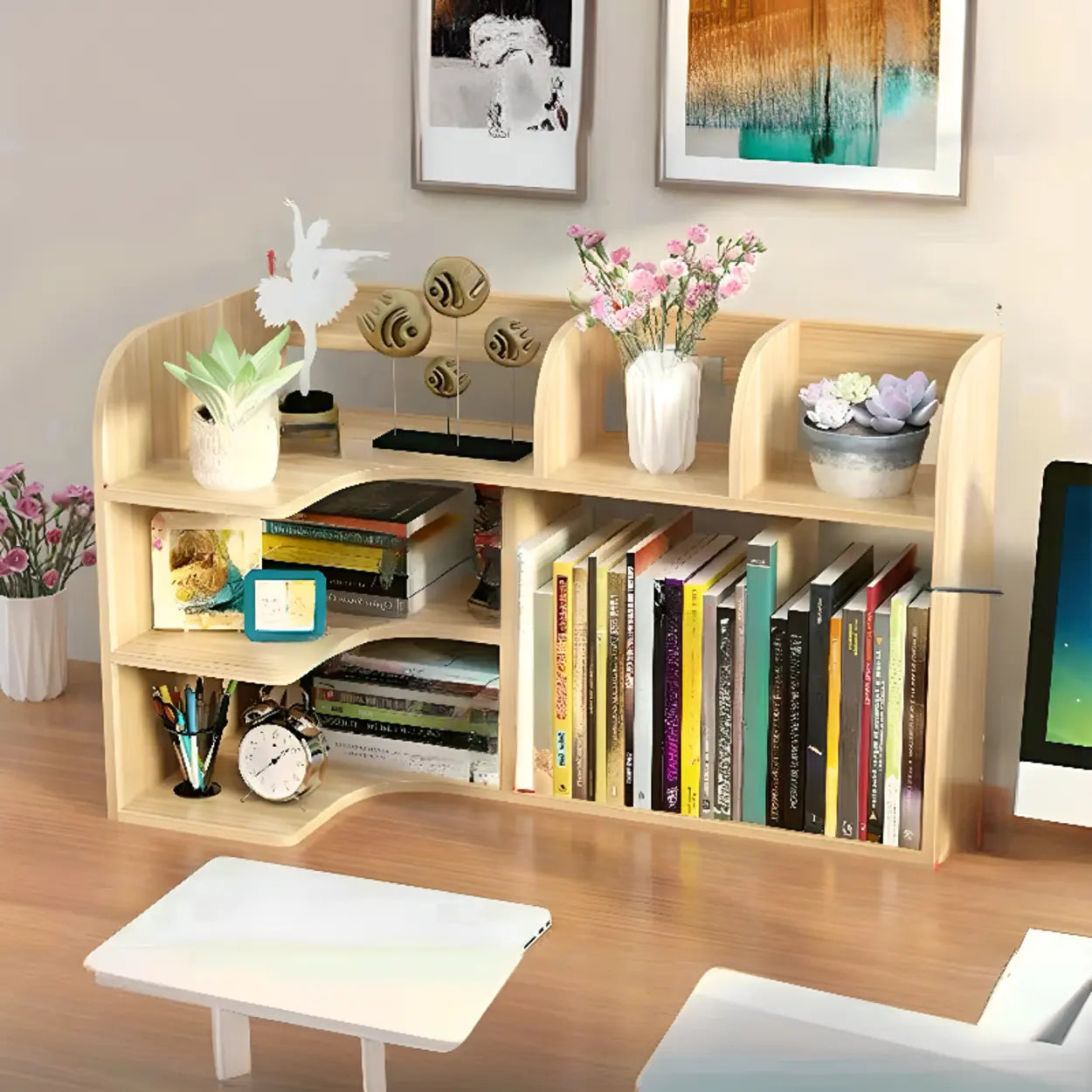 This modern white curved desk stand is your ideal choice for improving work efficiency and decorative beauty. Made of high-quality MDF material, it is sturdy and durable, and the unique three-layer design provides excellent storage space to help you organize books, documents, and small items efficiently. Its stylish white color and elegant curved shape bring a new look to your desk and fit any home or office decoration style. Whether you are a student or a professional, this bookshelf can meet your needs and provide ample storage and decorative space for dual use.