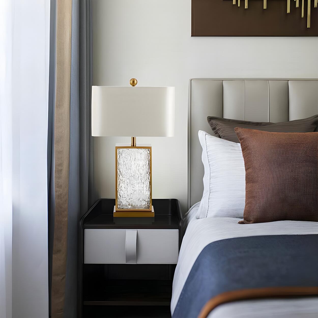 This modern rectangular glass table lamp, with a simple fabric lampshade, has an elegant design. The base of the lamp is made of transparent glass, showing a unique texture effect. It is easy to place in the living room or bedroom, adding a sense of fashion to the home.