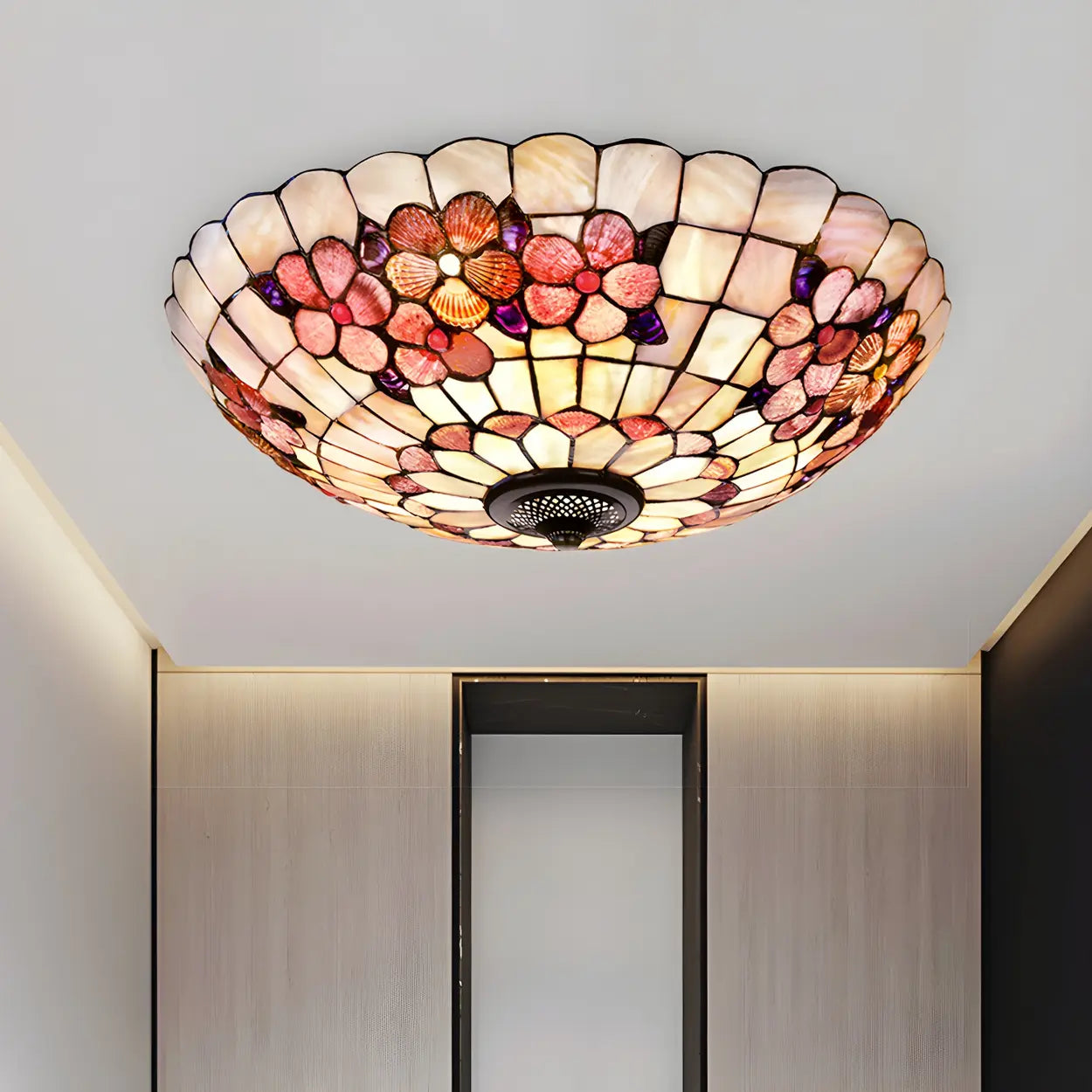 - This Tiffany-style ceiling lamp combines pink and shell materials to create an elegant and warm space atmosphere.