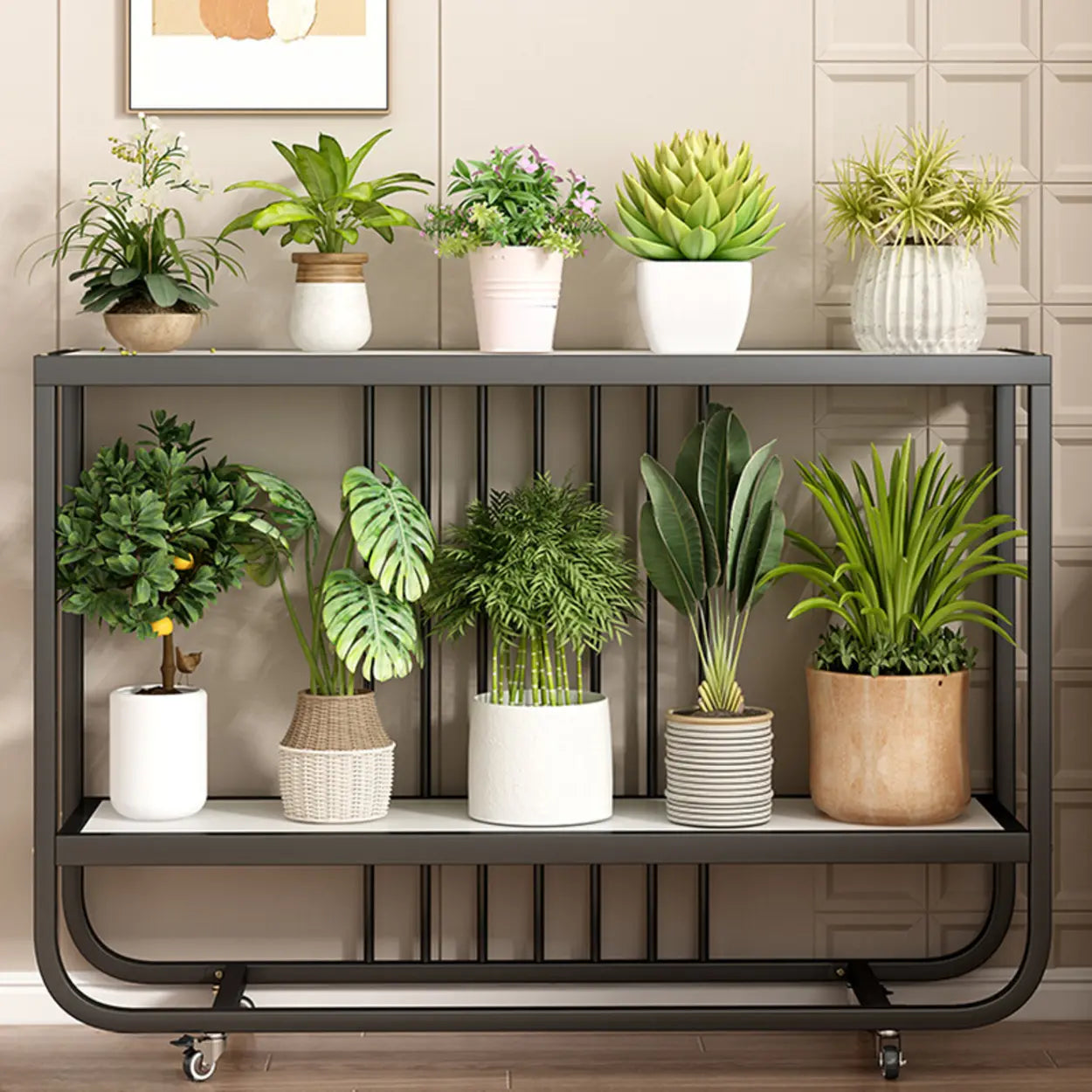 Trendy Rectangle Metal Rolling 2 Tier Plant Stand Black