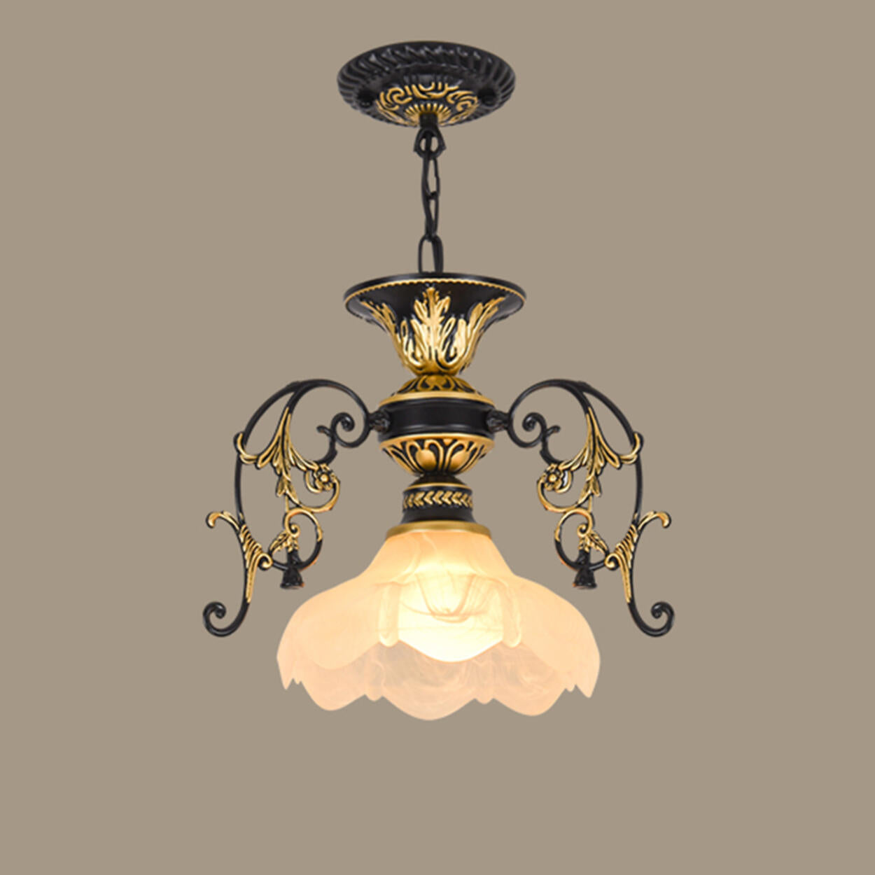 Retro design. Combine black and gold carved metal with the flower-shaped glass lampshade to create a luxurious retro atmosphere.
