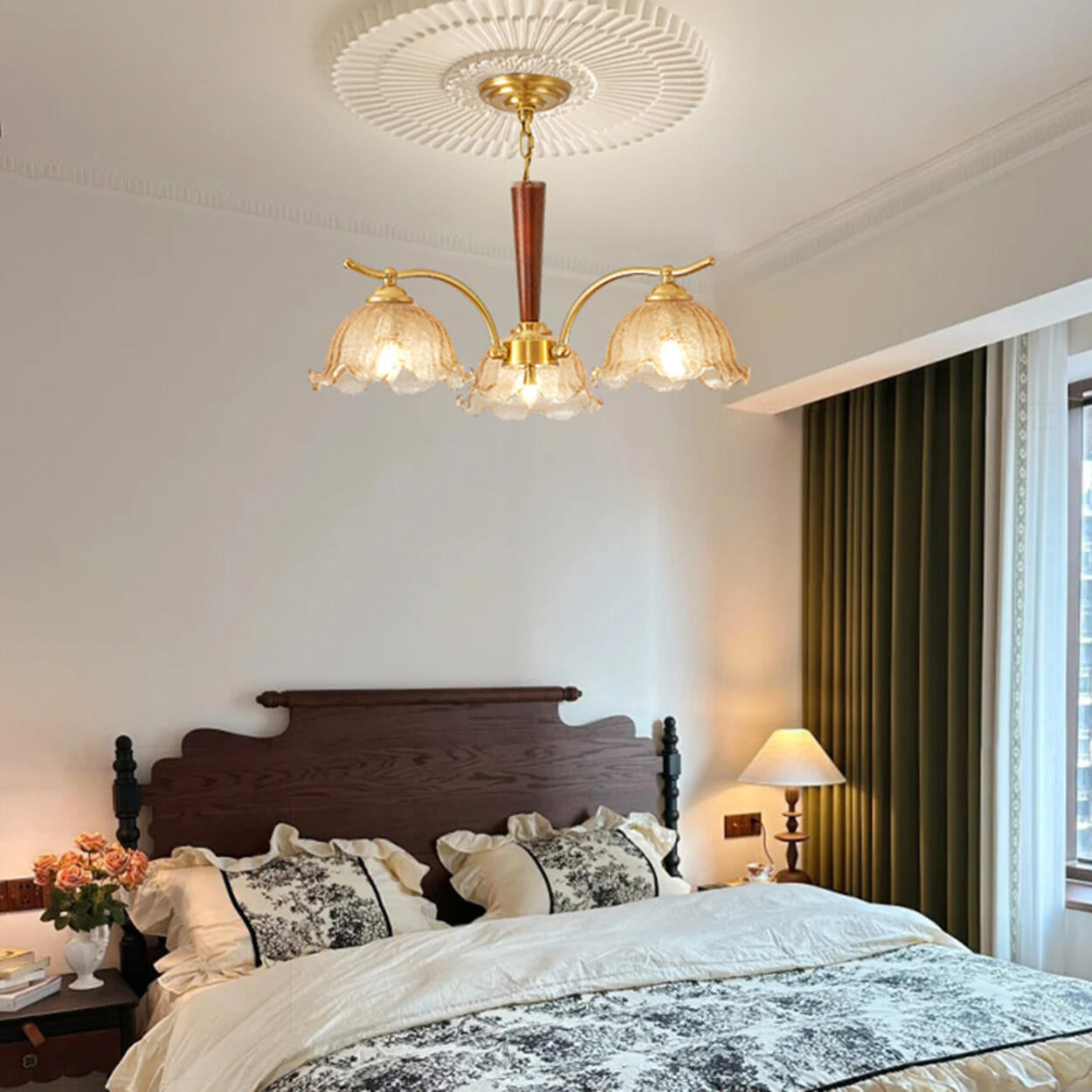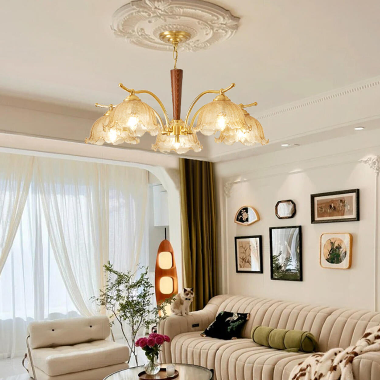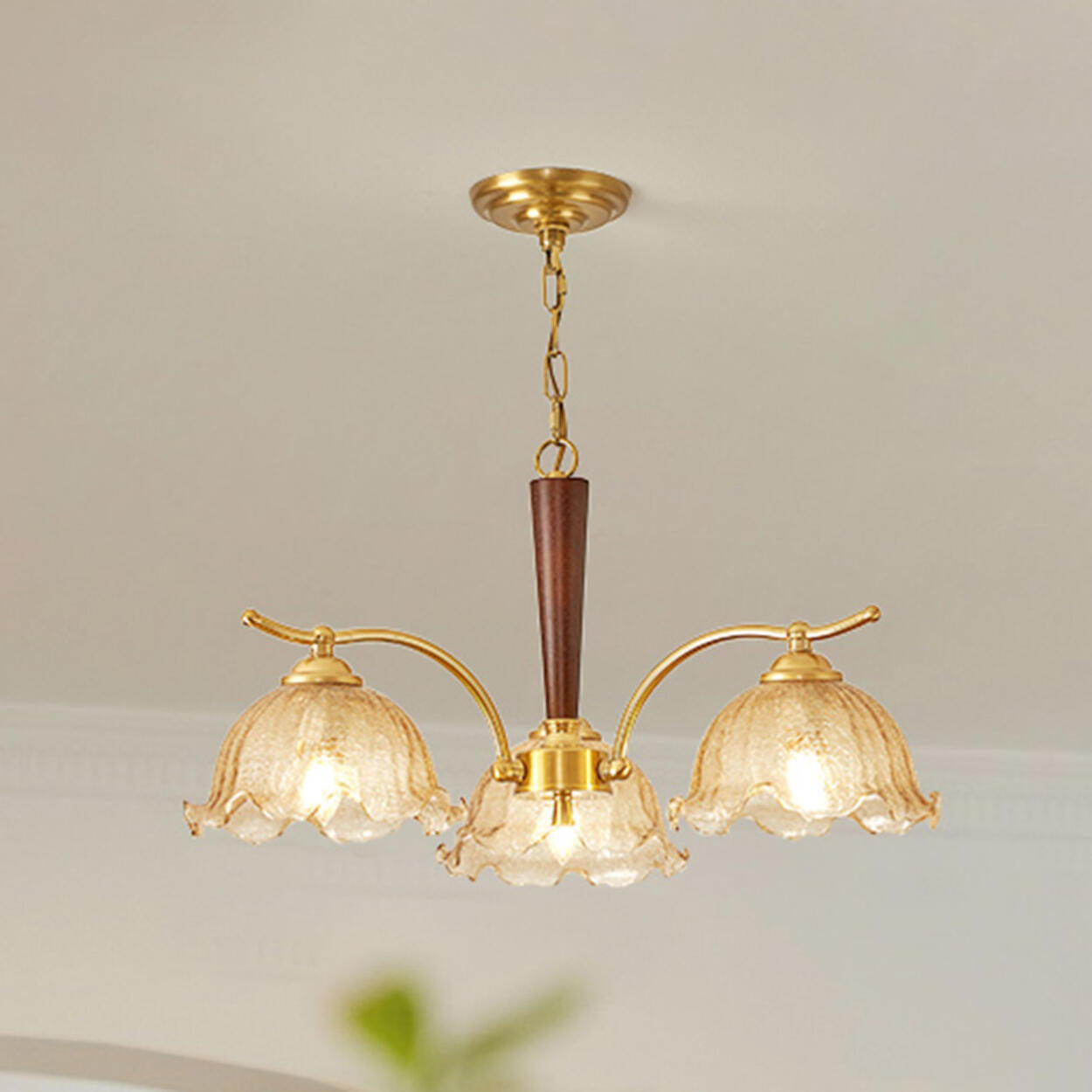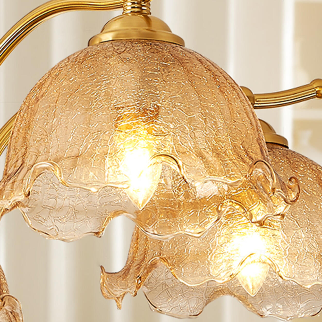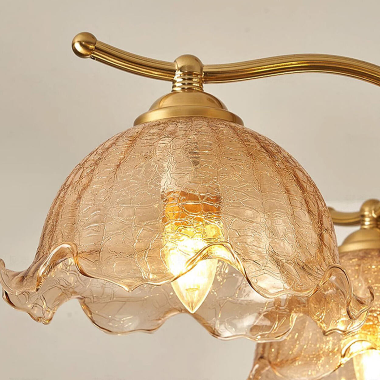 The vintage gold frame paired with flower-shaped amber glass shades creates a timeless and sophisticated look, adding classic charm to any room.