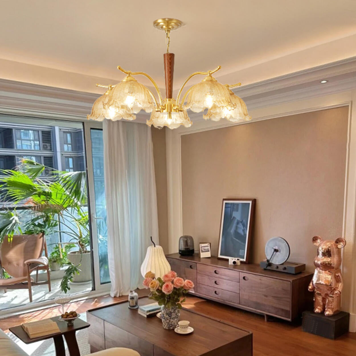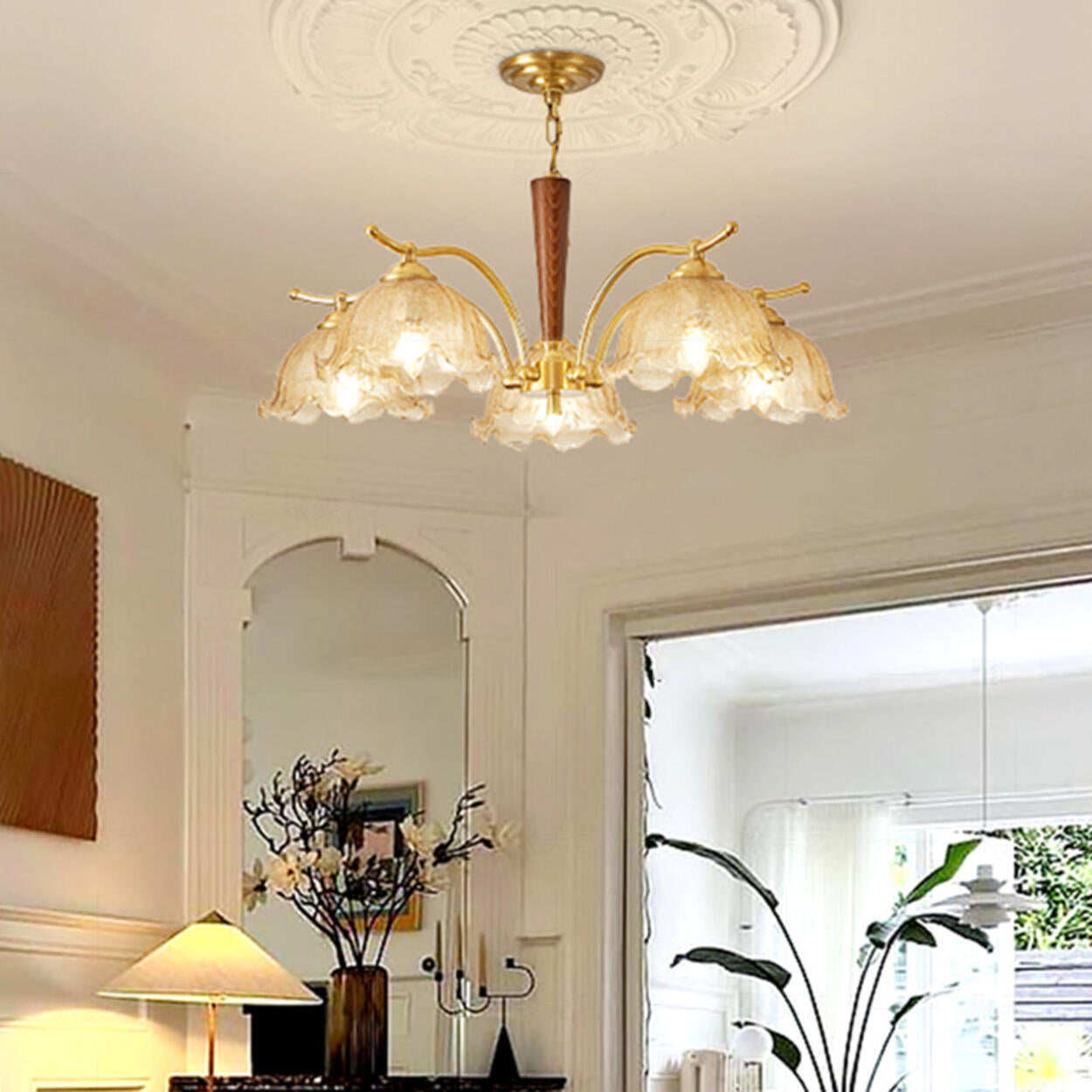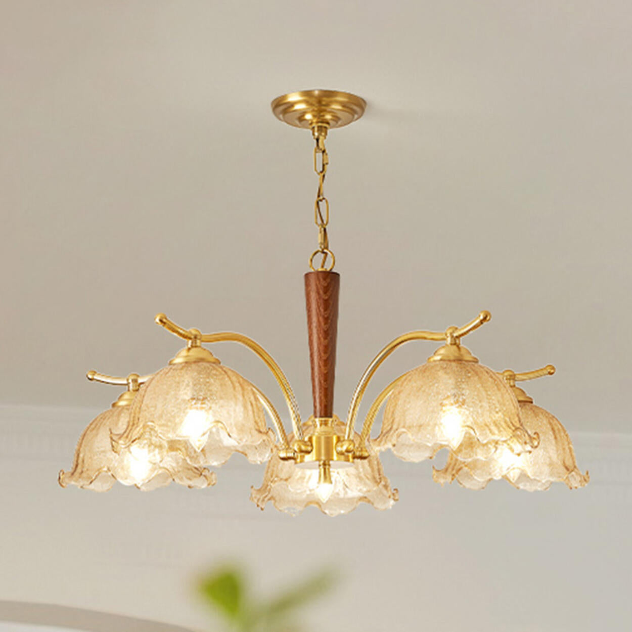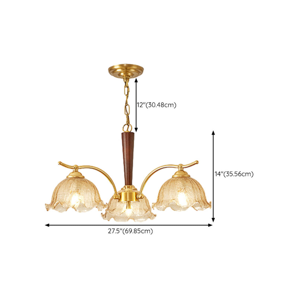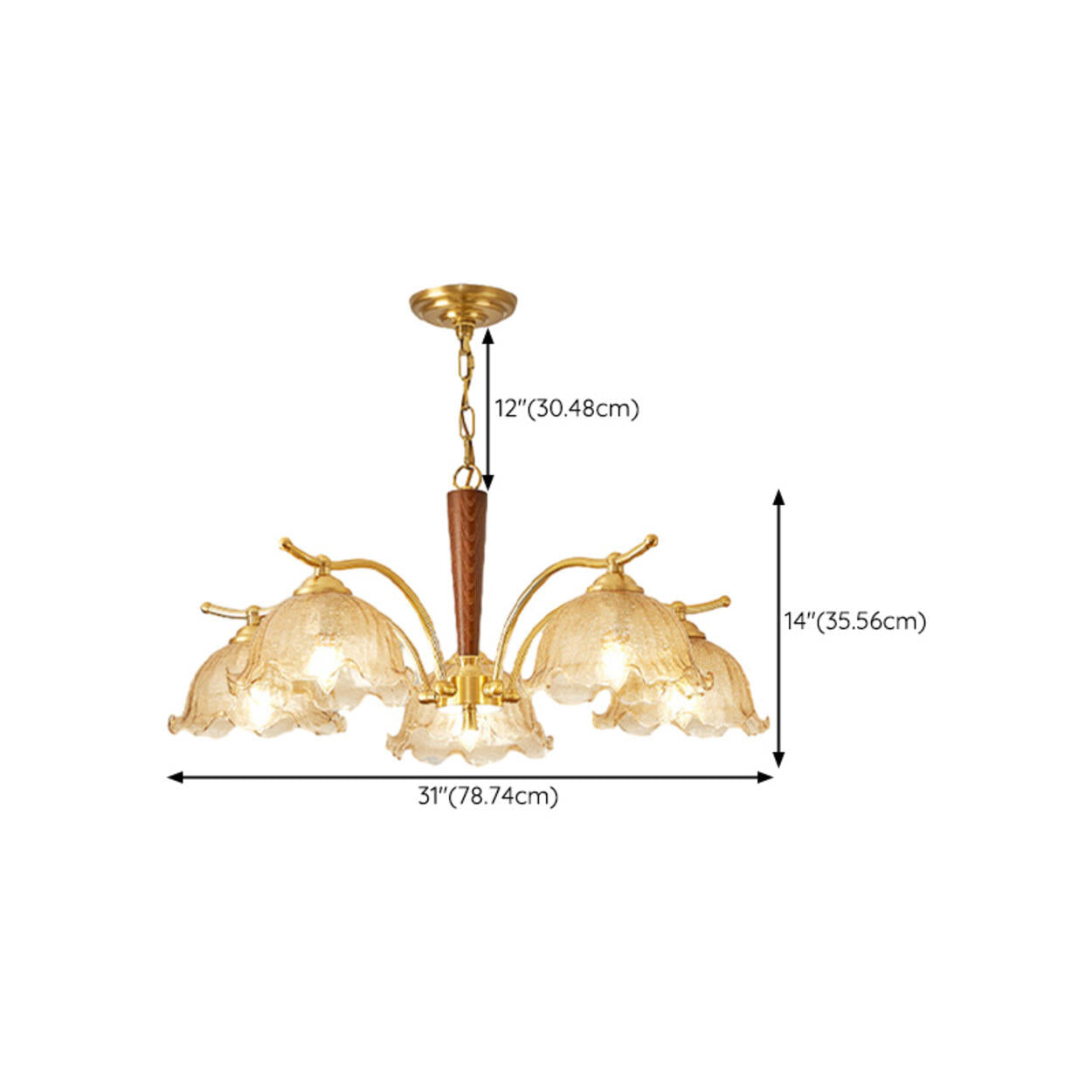 The vintage gold frame paired with flower-shaped amber glass shades creates a timeless and sophisticated look, adding classic charm to any room.