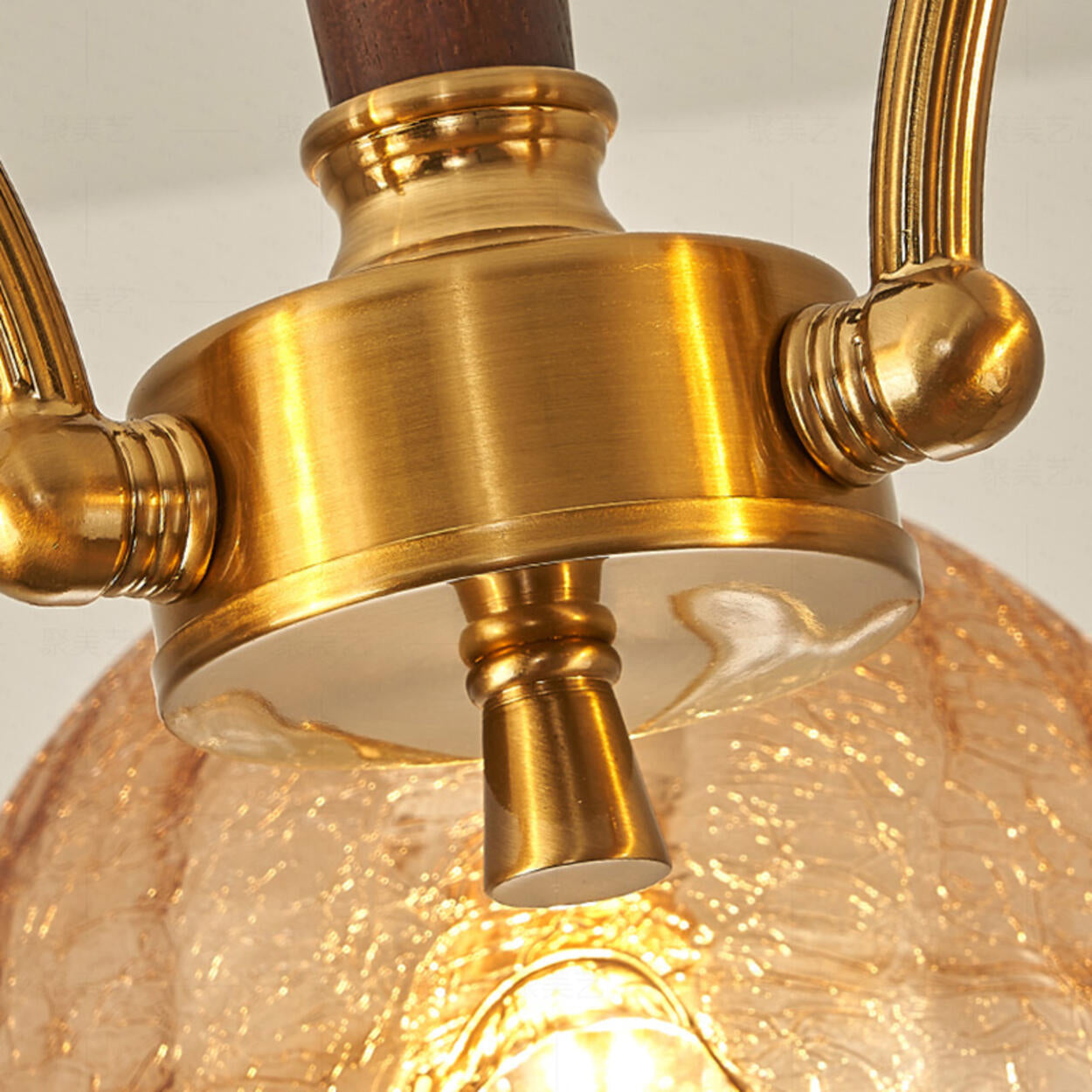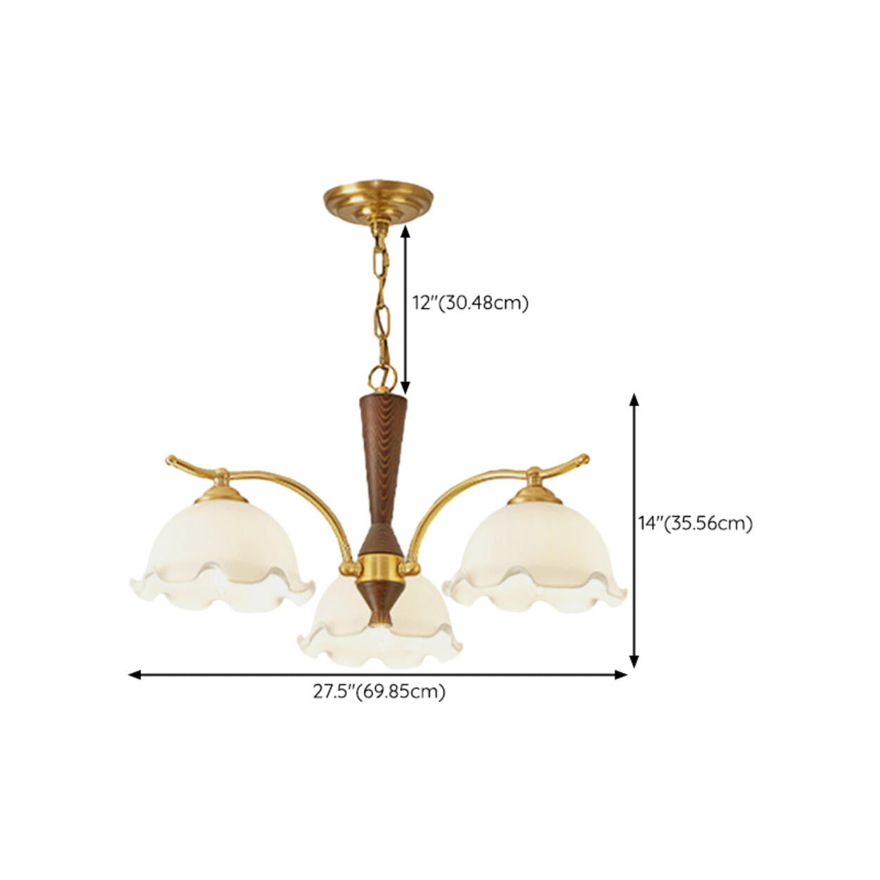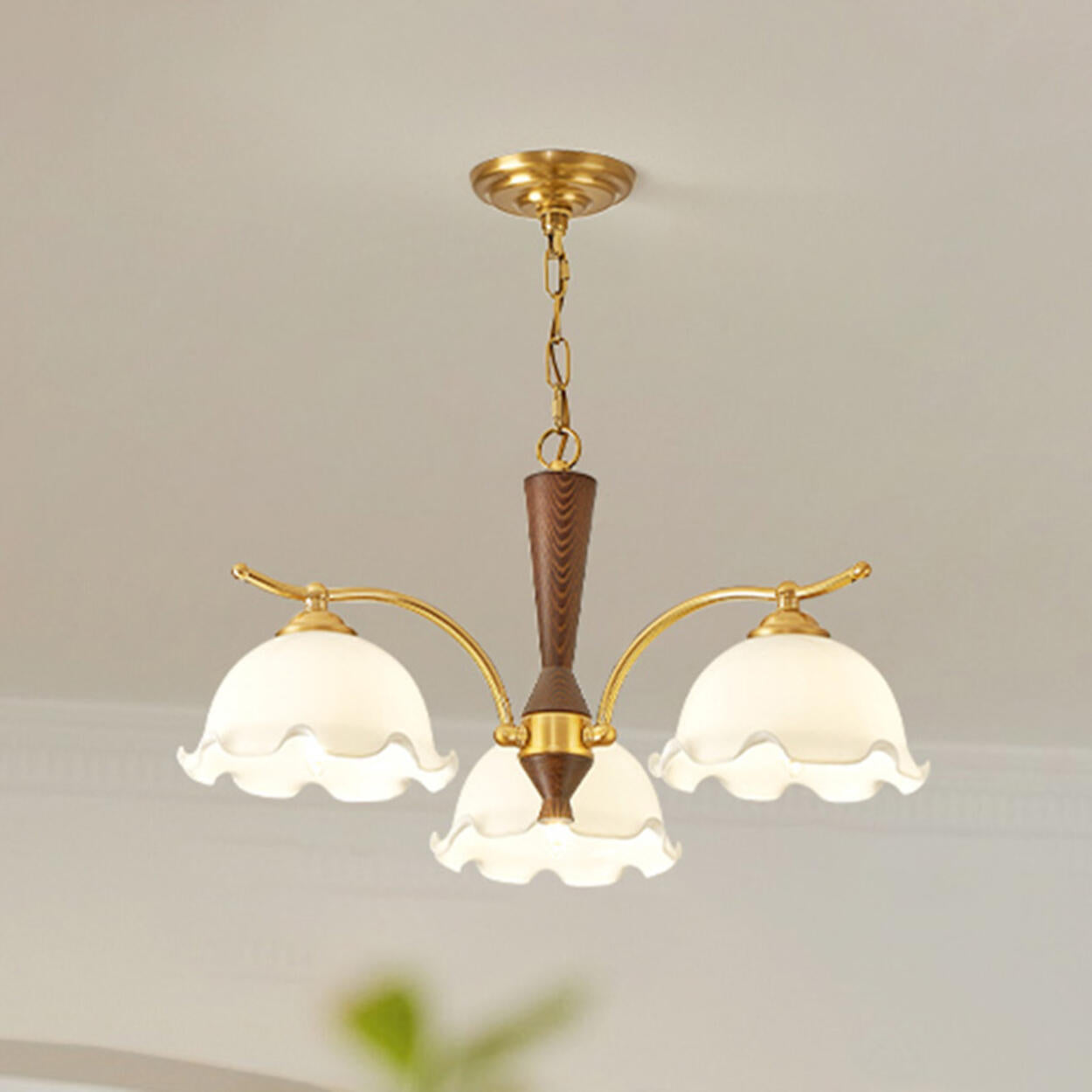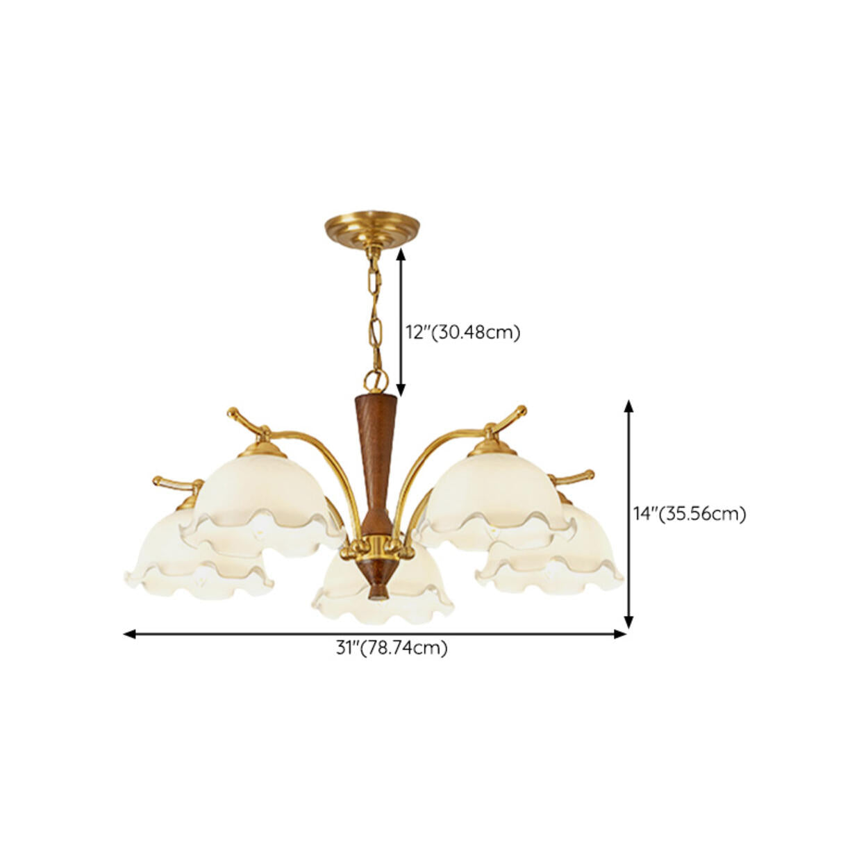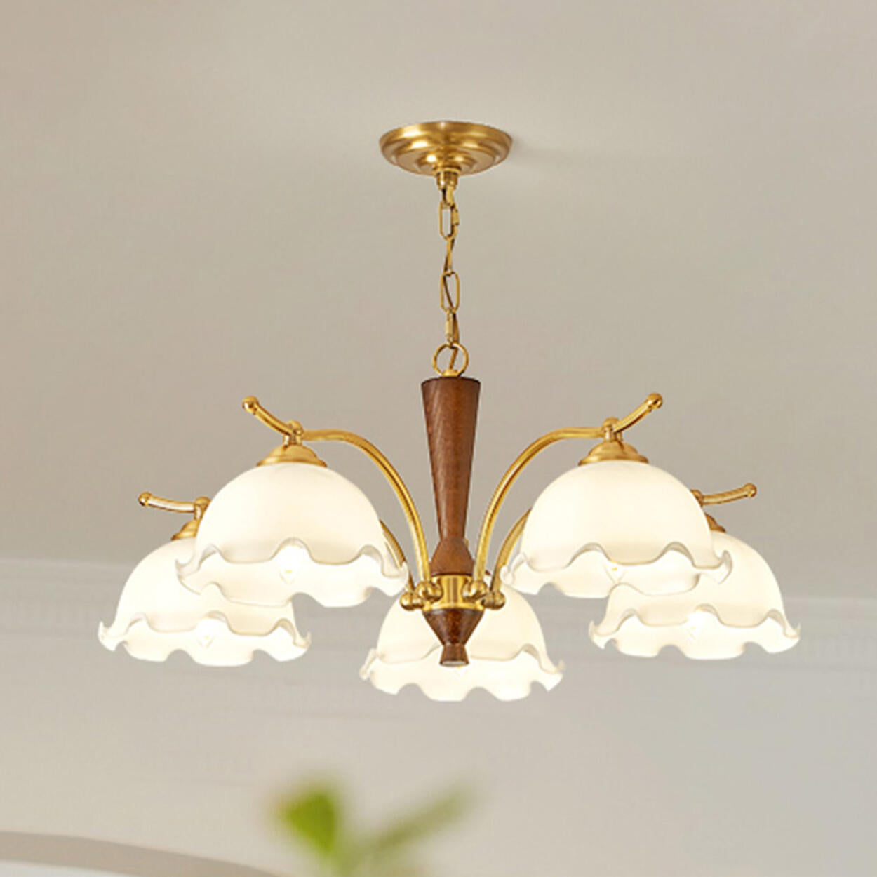 The vintage gold frame paired with flower-shaped amber glass shades creates a timeless and sophisticated look, adding classic charm to any room.