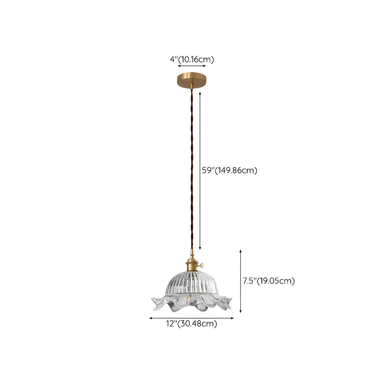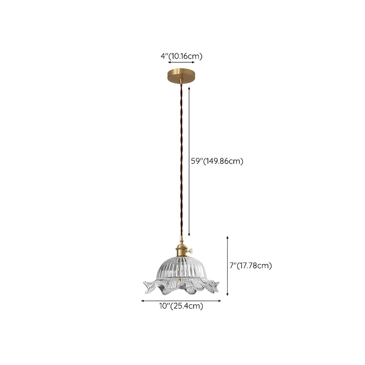 This modern pendant light features a flower-shaped transparent glass lampshade as a design highlight, paired with a brass lamp base, creating an elegant and romantic atmosphere. The glass lampshade emits a soft glow under the light, adding a touch of warm texture to the space. It well suits dining rooms, living rooms, or bedrooms, contributing to a unique retro aesthetic.