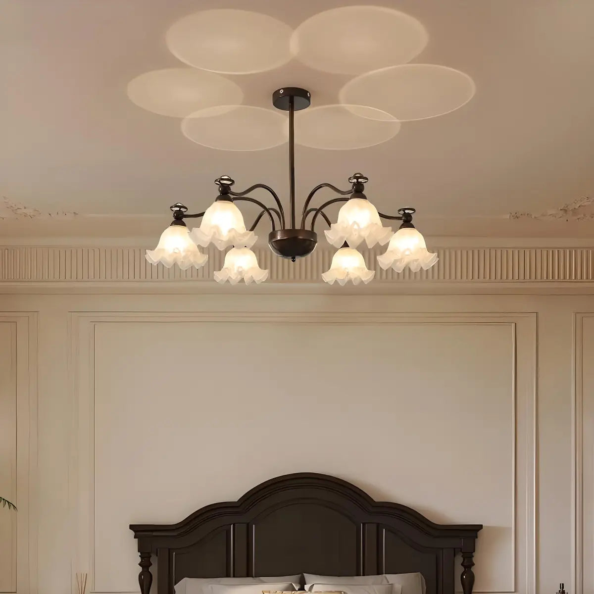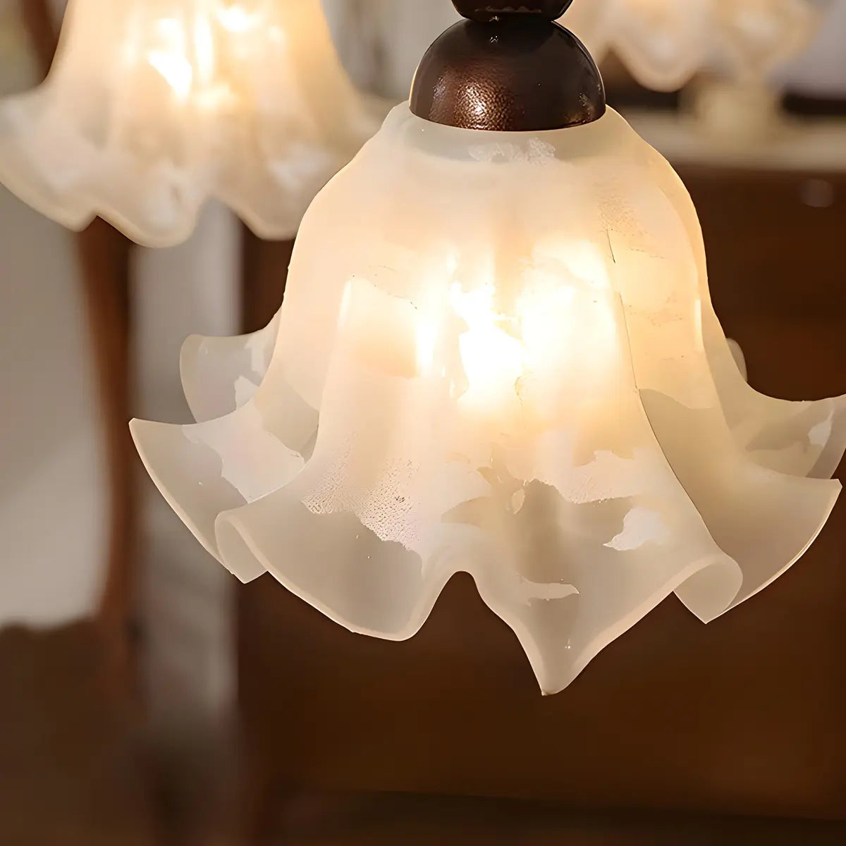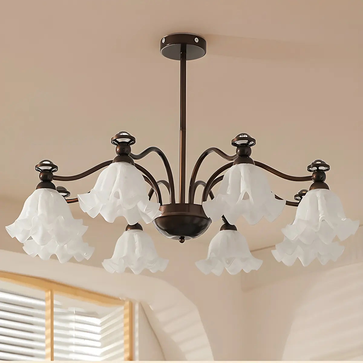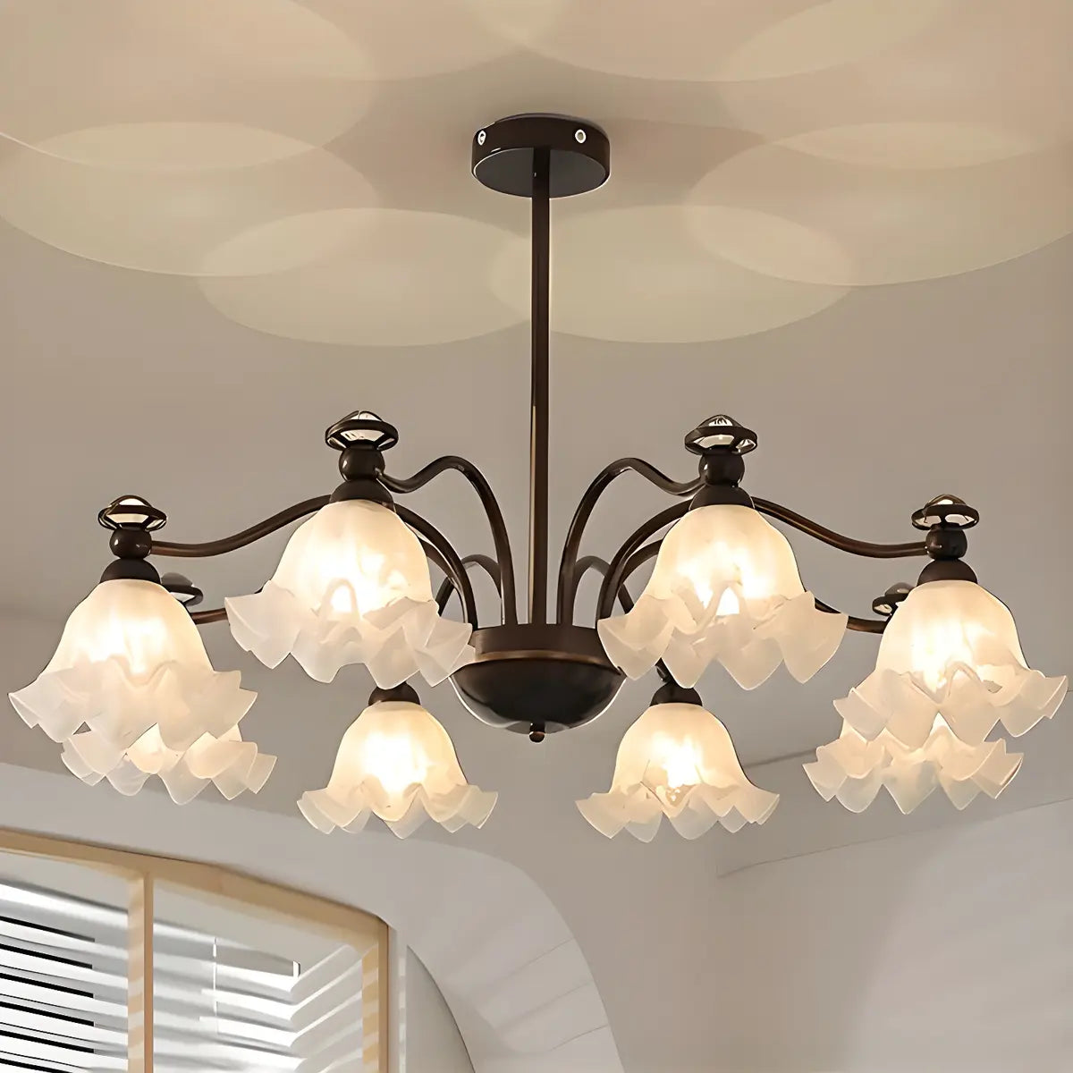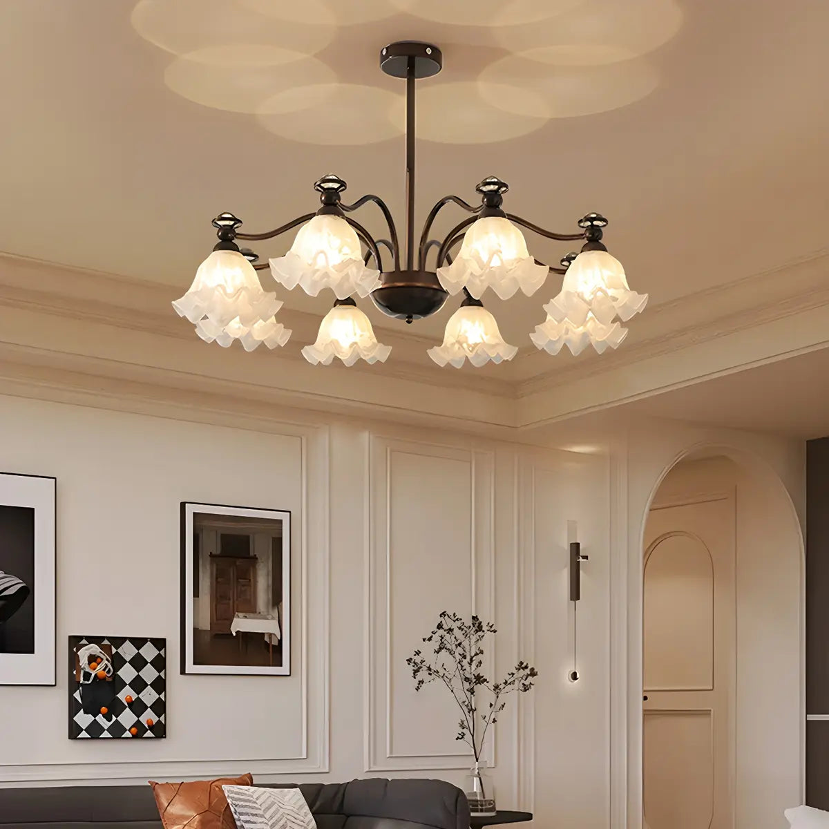This vintage-style flower glass chandelier will add an elegant touch to your living room. Inspired by the soft curves of petals, its elegant shape seems to bloom in the air while emitting warm and soft light, which not only provides lighting but also increases visual enjoyment.