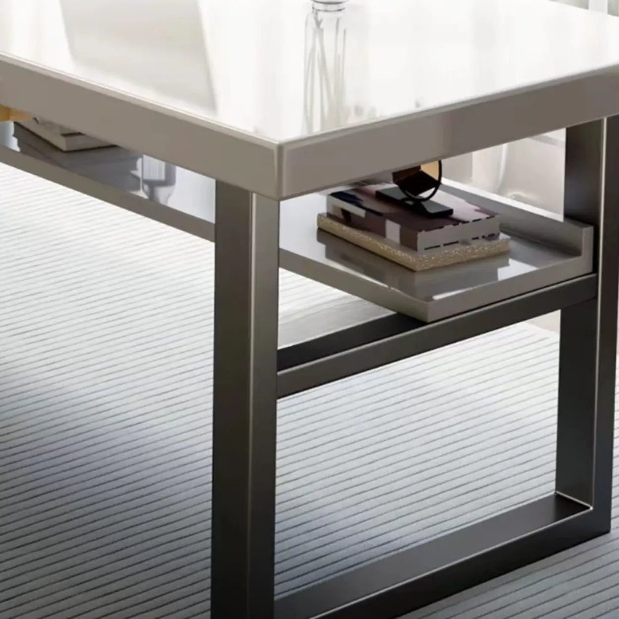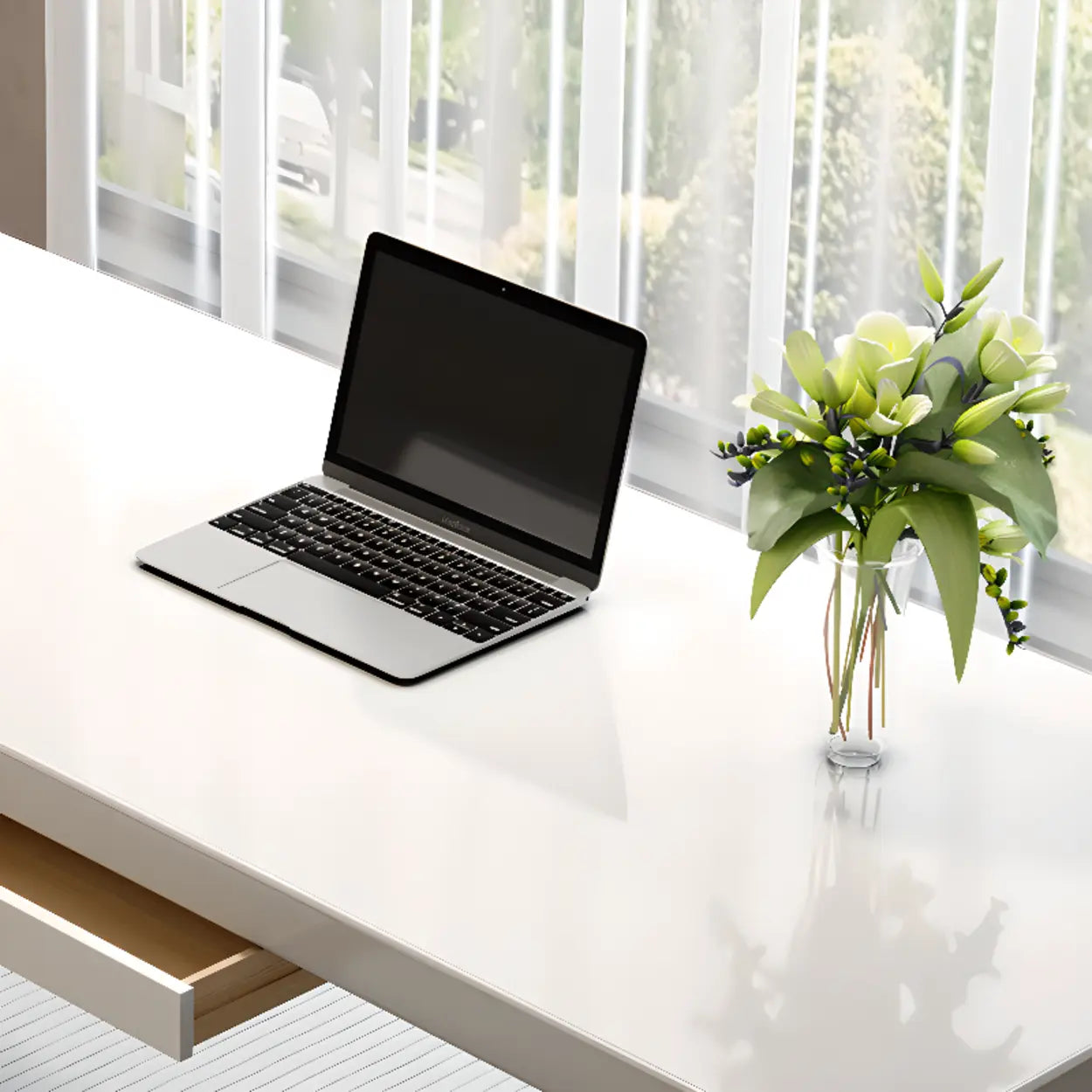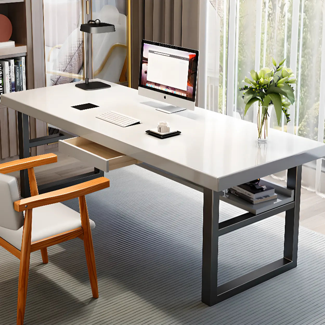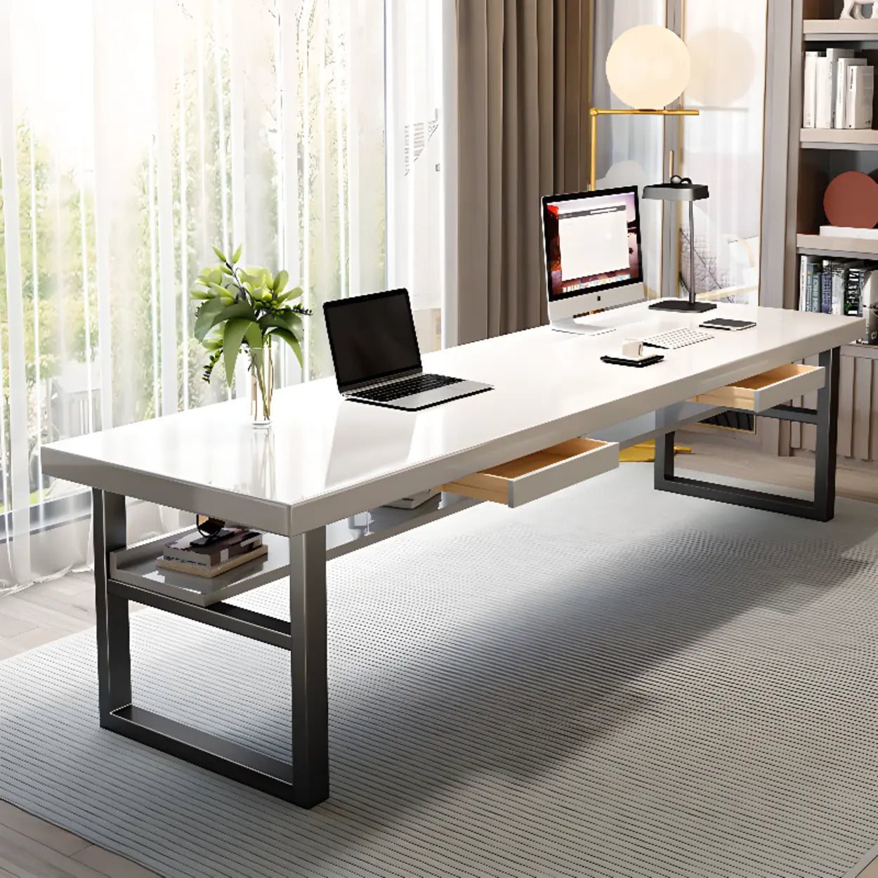This stylish white rectangular desk stands out with its simple and refined layout, seamlessly merging with any interior ornamentation style. Composed of high-quality solid wood, this desk furnishes immaculate solidity and durability. Its abundant work surface can contain two people at the same time, making it immaculate for home offices or shared workspaces. Built-in drawers furnish an extra repository area, helping to keep your desktop neat and arranged. Whether at home or in the office, this desk nourishes great consolation and expediency, greatly enhancing your work or study efficiency.