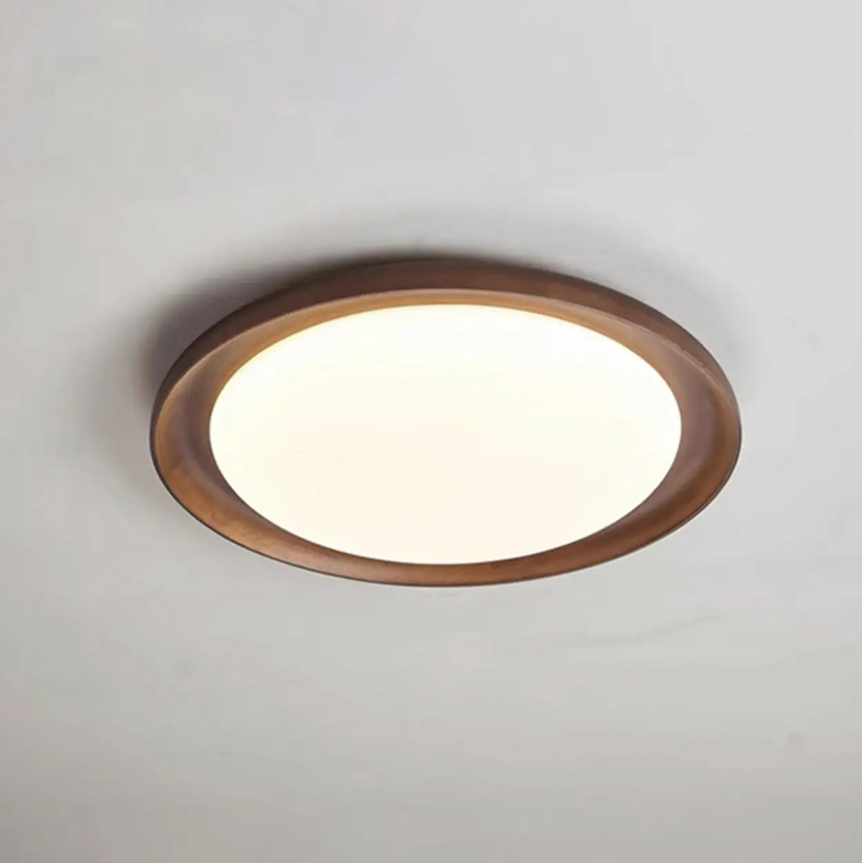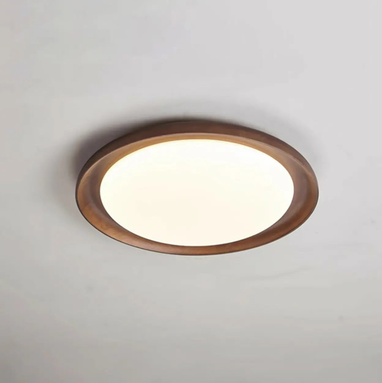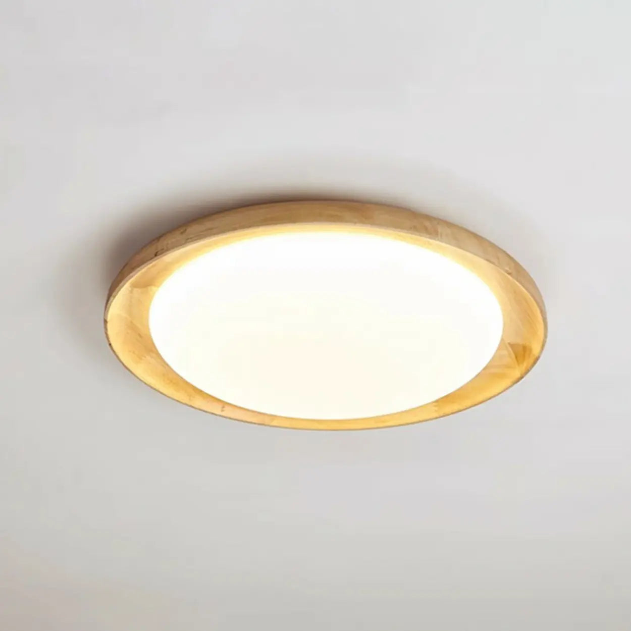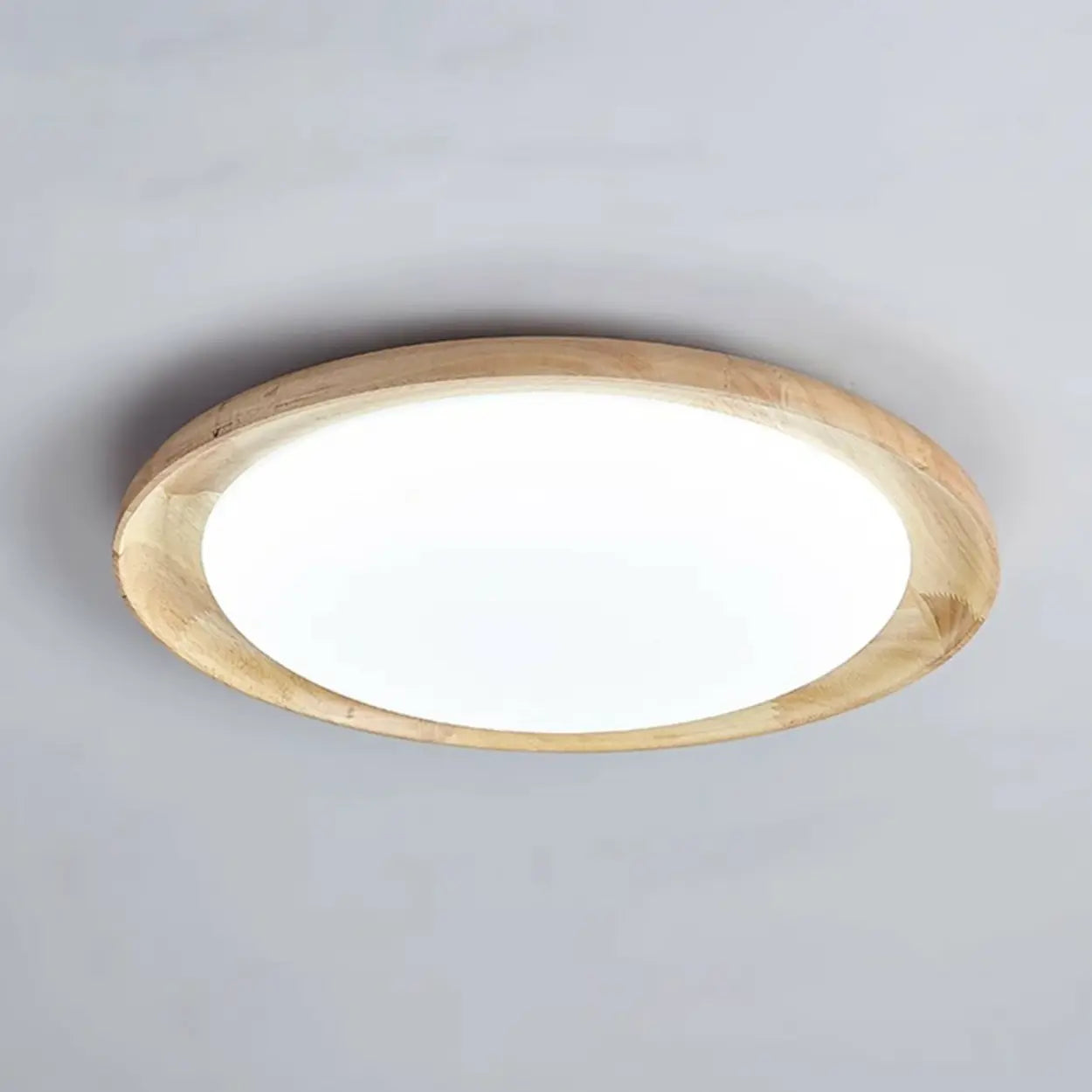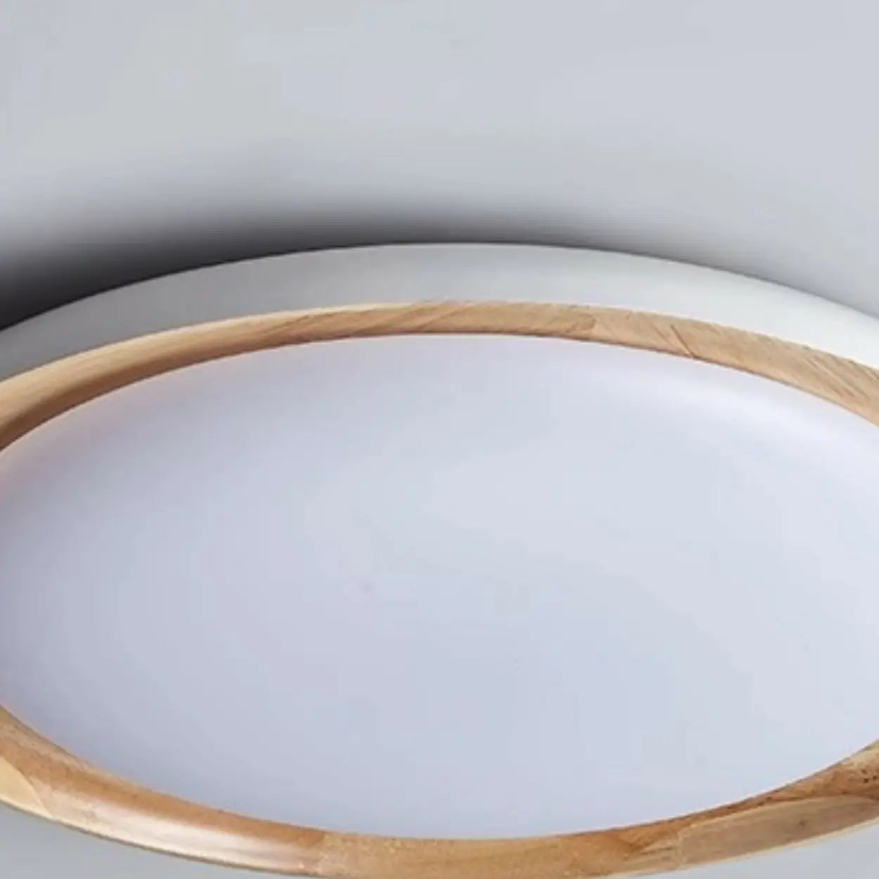 This circular ceiling light features a warm wooden frame design, adding a natural texture to the home space.