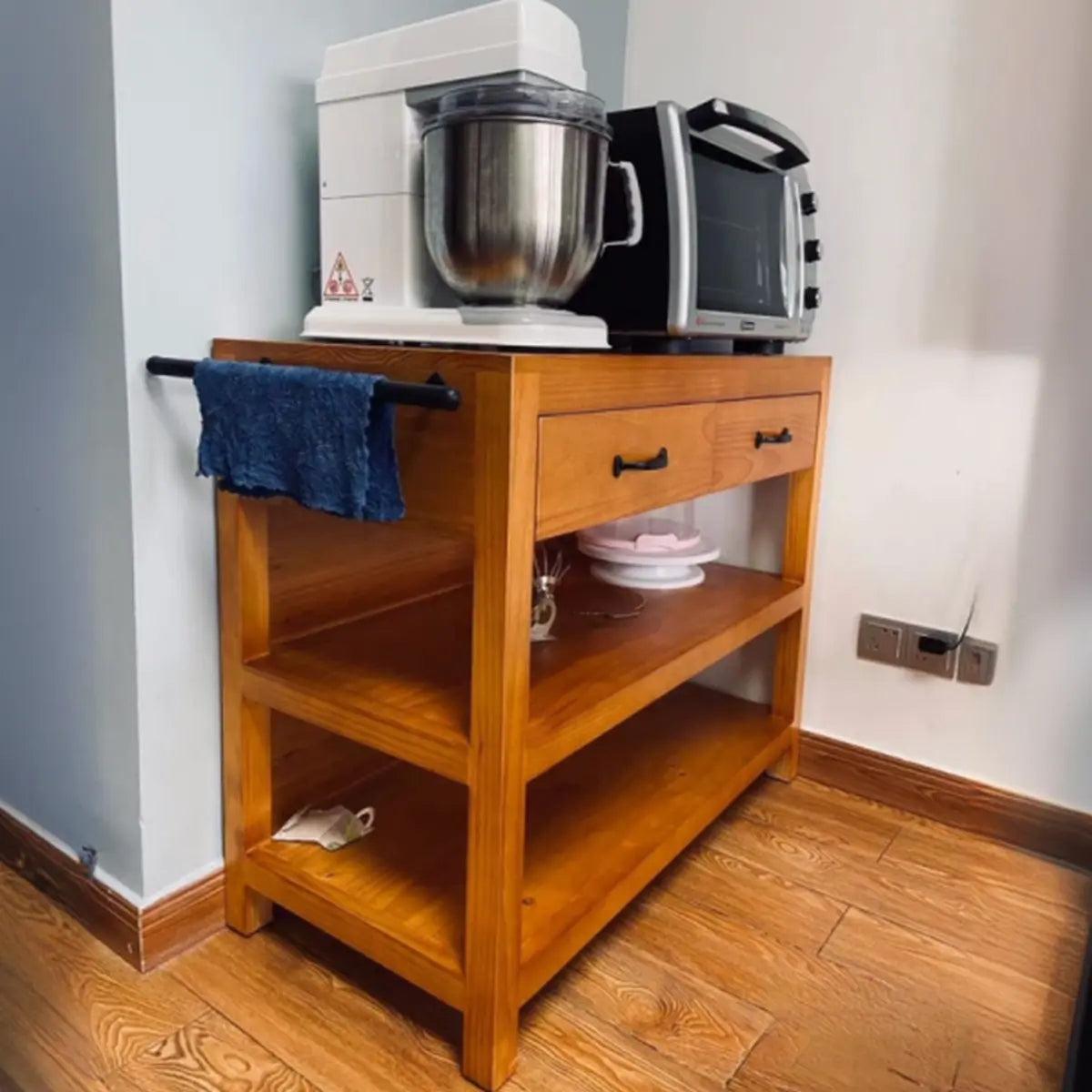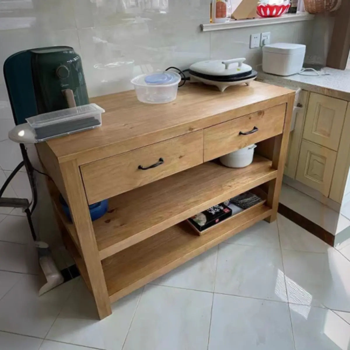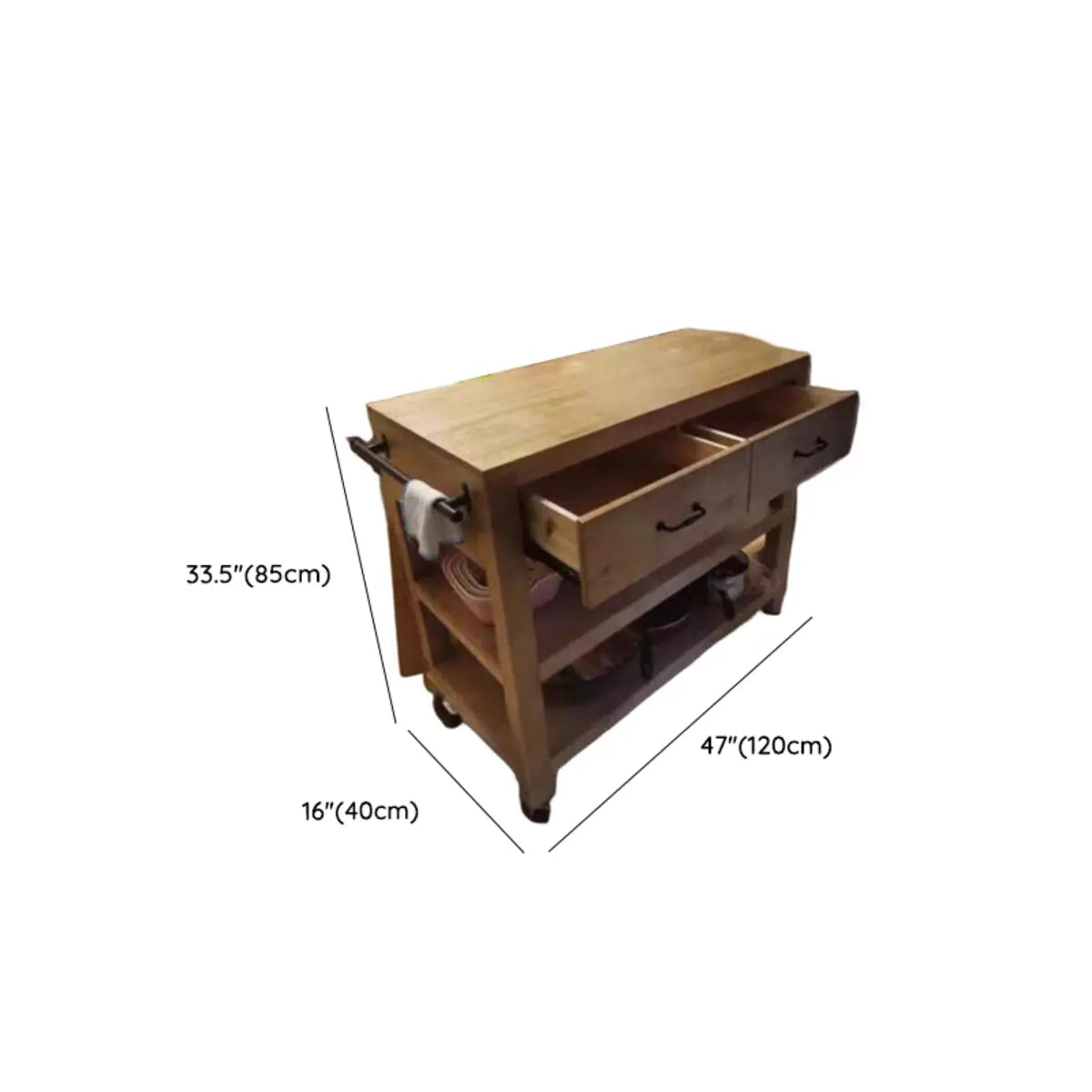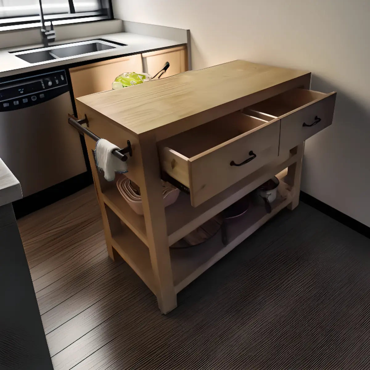 This wooden kitchen island perfectly combines functionality and beauty, heightening a touch of elegance to your kitchen. Its classic brown exterior is durable and smooth to match various kitchen styles. Spacious countertops allow for food preparation and cooking. Additionally, drawers and open shelves give convenient storage solutions. So it is the perfect choice for improving your kitchen efficiency.